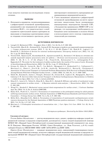 4. Grunau B., Kime N., Leroux B., Rea T., Van Belle G., Menegazzi J. J., Kudenchuk P. J., Vaillancourt C., Morrison L. J., Elmer J., Zive D. M., Le N. M., Austin M., Richmond N. J., Herren H., Christenson J. Association of Intra-arrest Transport vs Continued On-Scene Resuscitation With Survival to Hospital Discharge Among Patients With Out-of-Hospital Cardiac Arrest // JAMA. 2020. Vol. 324, No. 11. P. 1058-1067.