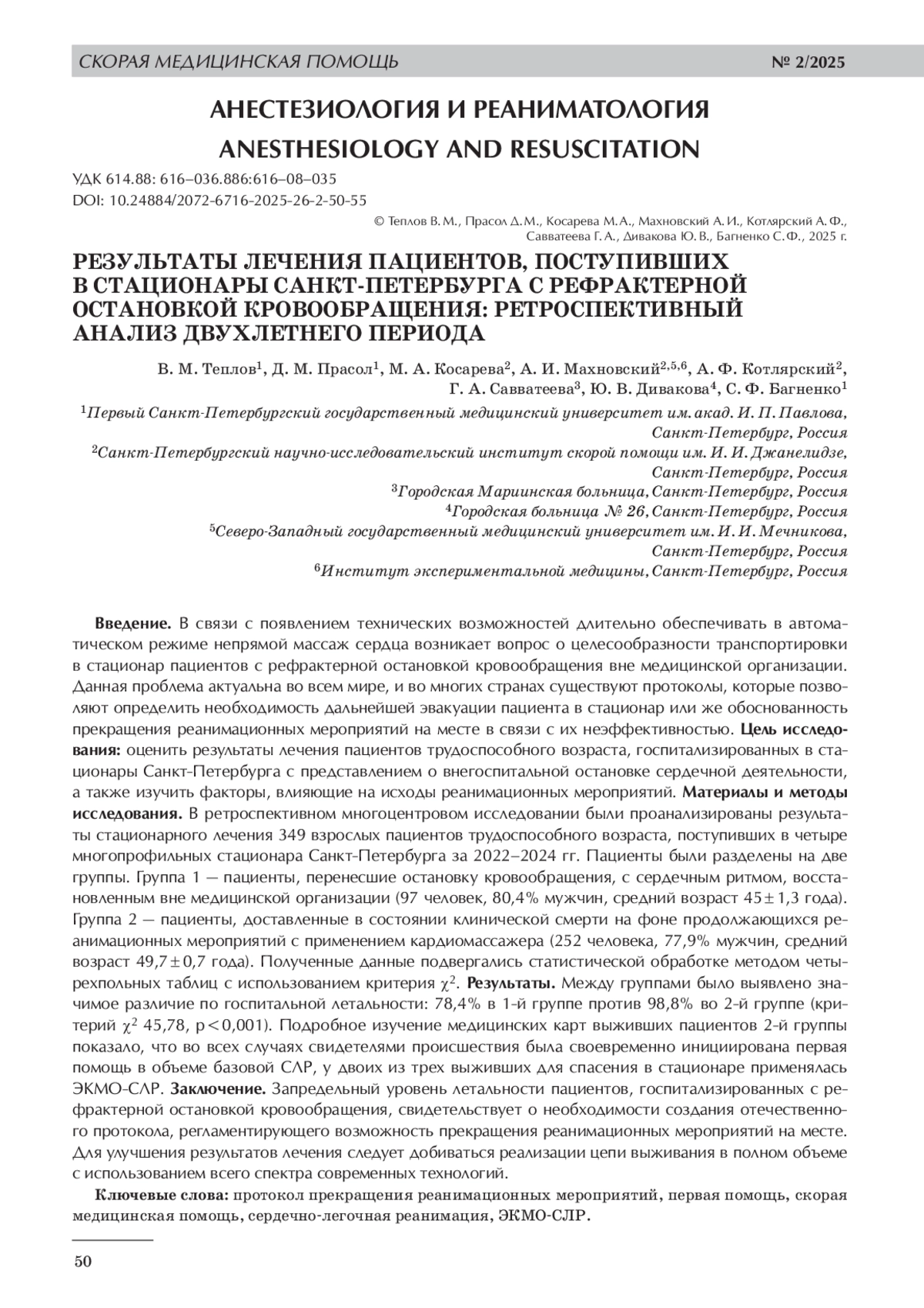 В связи с появлением технических возможностей длительно обеспечивать в автоматическом режиме непрямой массаж сердца возникает вопрос о целесообразности транспортировки в стационар пациентов с рефрактерной остановкой кровообращения вне медицинской организации. Данная проблема актуальна во всем мире, и во многих странах существуют протоколы, которые позволяют определить необходимость дальнейшей эвакуации пациента в стационар или же обоснованность прекращения реанимационных мероприятий на месте в связи с их неэффективностью. Цель исследования: оценить результаты лечения пациентов трудоспособного возраста, госпитализированных в стационары Санкт-Петербурга с представлением о внегоспитальной остановке сердечной деятельности, а также изучить факторы, влияющие на исходы реанимационных мероприятий. Материалы и методы исследования. В ретроспективном многоцентровом исследовании были проанализированы результаты стационарного лечения 349 взрослых пациентов трудоспособного возраста, поступивших в четыре многопрофильных стационара Санкт-Петербурга за 2022–2024 гг. Пациенты были разделены на две группы. Группа 1 — пациенты, перенесшие остановку кровообращения, с сердечным ритмом, восстановленным вне медицинской организации (97 человек, 80,4% мужчин, средний возраст 45±1,3 года). Группа 2 — пациенты, доставленные в состоянии клинической смерти на фоне продолжающихся реанимационных мероприятий с применением кардиомассажера (252 человека, 77,9% мужчин, средний возраст 49,7±0,7 года). Полученные данные подвергались статистической обработке методом четырехпольных таблиц с использованием критерия χ2. Результаты. Между группами было выявлено значимое различие по госпитальной летальности: 78,4% в 1‑й группе против 98,8% во 2‑й группе (критерий χ2 45,78, p<0,001). Подробное изучение медицинских карт выживших пациентов 2‑й группы показало, что во всех случаях свидетелями происшествия была своевременно инициирована первая помощь в объеме базовой СЛР, у двоих из трех выживших для спасения в стационаре применялась ЭКМО-СЛР. Заключение. Запредельный уровень летальности пациентов, госпитализированных с рефрактерной остановкой кровообращения, свидетельствует о необходимости создания отечественного протокола, регламентирующего возможность прекращения реанимационных мероприятий на месте. Для улучшения результатов лечения следует добиваться реализации цепи выживания в полном объеме с использованием всего спектра современных технологий.