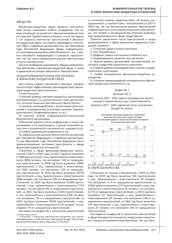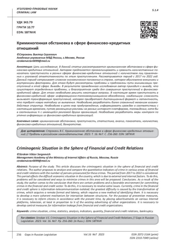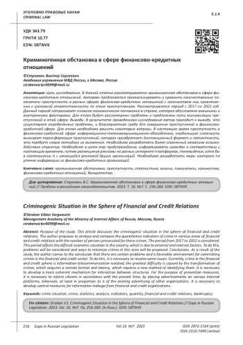 Цель исследования. В данной статье рассматривается криминогенная обстановка в сфере финансово-кредитных отношений. Автором предлагается проанализировать и сравнить количественные показатели преступности в разных сферах финансово-кредитных отношений с количеством лиц привлеченных к уголовной ответственности по этим преступлениям. Рассматривается период с 2017 по 2022 год. Данный период затрагивает сложное экономическое положение в стране, которое обусловлено внешними и внутренними факторами. Для этого будут рассмотрены проблемы и предложены пути минимизации преступлений в этой сфере. Выводы. В результате проведенного исследования автор приходит к выводу, что существуют определённые проблемы, и благоприятная среда для совершения преступлений в финансово-кредитной сфере. Для этого необходимо решить некоторые вопросы. В настоящее время преступность в финансово-кредитной сфере информационно-телекоммуникационно-обособленна, наибольшую сложность вызывает трансформация преступлений, которая приобретает дистанционный формат и латентность, что требует новую методику их выявления. Необходимо разработать более слаженный механизм взаимодействия структур. Необходимо в целях мер предупреждения, информировать граждан в соответствии с настоящим временем, путем размещения рекламы на разных интернет платформах, телевидение, хотя бы в соотношении ¼ с имеющейся рекламой других организаций. Необходимо разработать меры контроля по утечке информации из финансово-кредитных организаций.
