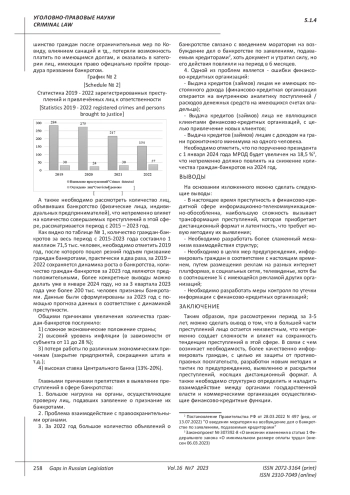 Статистика по статьям о банкротстве с 2019 по 2022 года. За 2019 год было выявлено 284 преступлений, а лиц, привлечённых к ответственности 30 человек, что составляет 11 % от совершённых преступлений, за 2020 год было выявлено 275 преступлений, а лиц, привлечённых к ответственности 24 человек, что составляет 9 % от совершённых преступлений, за 2021 год было выявлено 217 преступлений, а лиц, привлечённых к ответственности 30 человек, что составляет 14% от совершённых преступлений, за 2022 год было выявлено 154 преступлений, а лиц, привлечённых к ответственности 37 человек, что составляет 24% от совершённых преступлений.