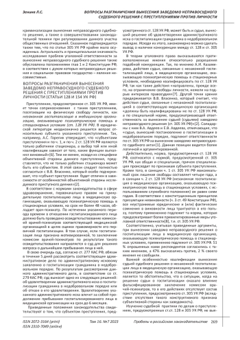 1. Авдеев В.А., Авдеева Е.В. Актуальные вопросы квалификации незаконного помещения в психиатрический стационар // Российский следователь. 2013. № 16. EDN: PIJKFK
