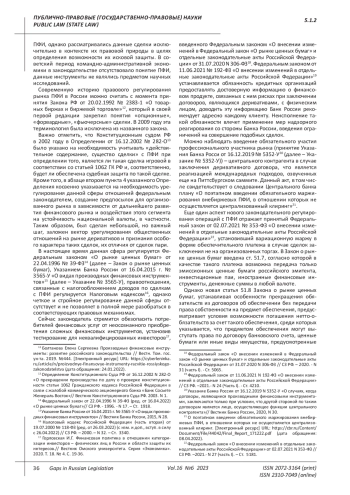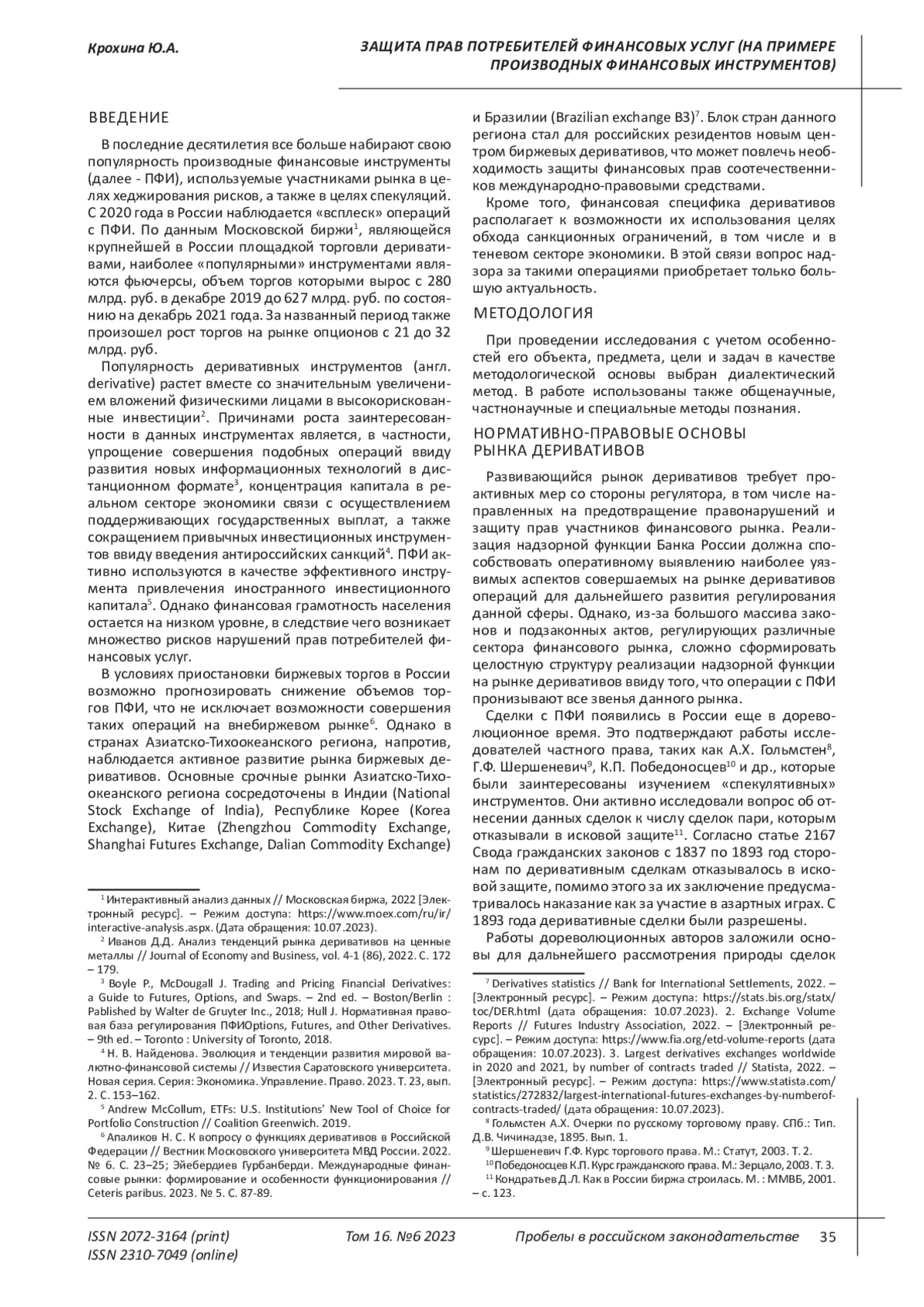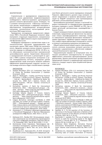 Производные финансовые инструменты используются участниками финансового рынка как в целях хеджирования рисков, так и в спекулятивном интересе. В последние годы у российских резидентов возрос интерес к операциями с деривативами, которые используются как альтернатива зарубежным инвестиционным продуктам, а также с целью обхода экономических санкций. По экономической сущности дериватив является сложным и высокорискованным финансовым инструментом, правовая регламентация которого несовершенная. Названные обстоятельства порождают большое количество нарушений прав потребителей финансовых услуг. Стандарт защиты прав потребителей финансовых услуг требует со стороны Банка России проактивных мер, направленных на предотвращение правонарушений и восстановление нарушенных прав участников сделок с производными финансовыми инструментами. Реализация названных полномочий регулятора затруднена в виду большого количества нормативных актов различного уровня, регулирующих дифференцированные сектора финансового рынка. Аргументированы предложения по повышению эффективности стандарта защиты прав потребителей финансовых услуг.