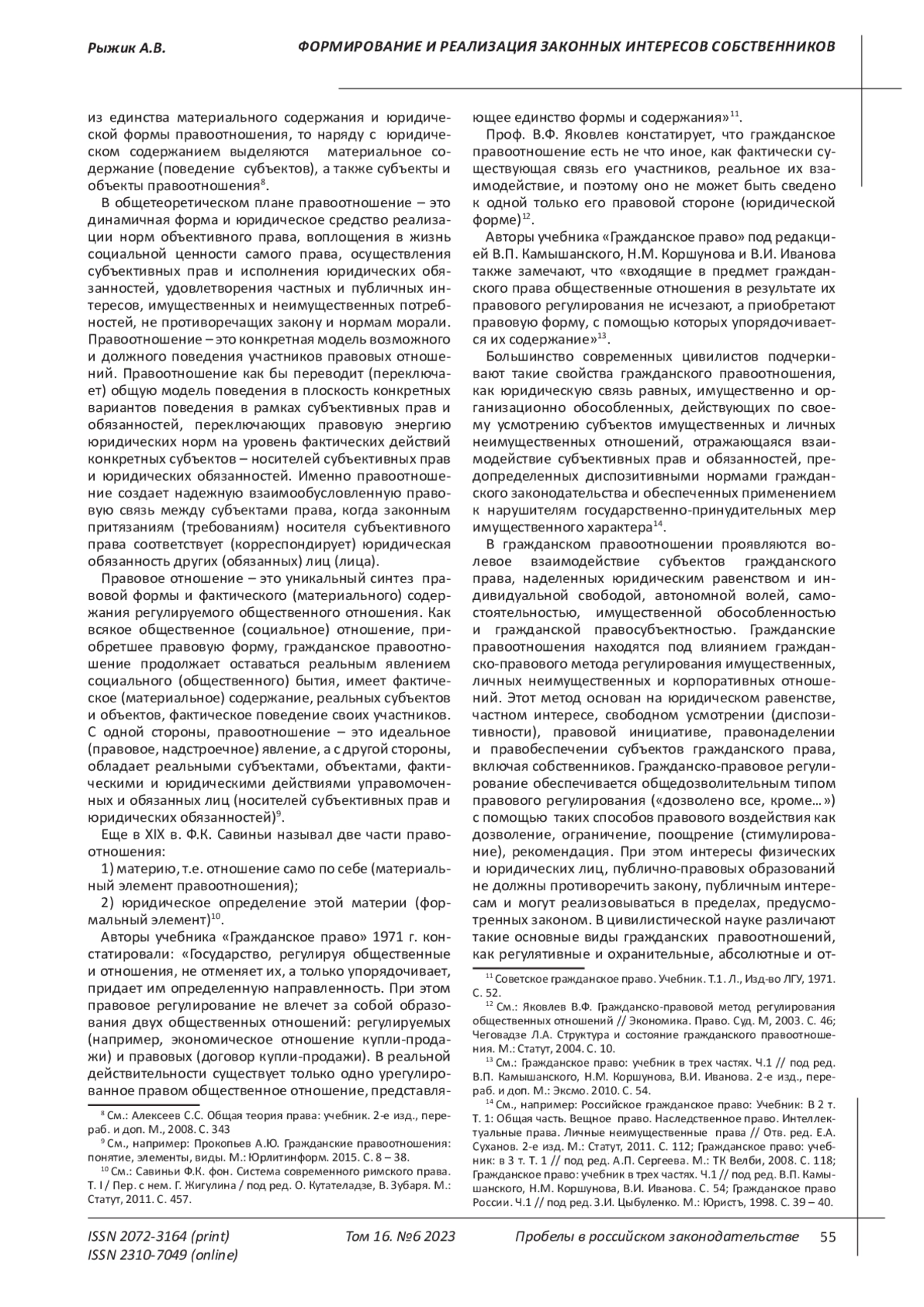 В статье рассматриваются вопросы формирования и реализации законных интересов собственников способы, приемы, методы, направленные на, реализацию и защиту законных интересов собственников. Важнейшее место среди них занимают приемы (методы), (включая методы дозволения, запрета и ограничений), нормы объективного права, институт права собственности, гражданско-правовая отрасль «вещное право» и иные отрасли гражданского права, вещные, обязательственные и иные правоотношения, субъективные права и юридические обязанности, договоры, соглашения об осуществлении корпоративных прав, имущество (вещи), их правовые режимы, правовой статус собственников.