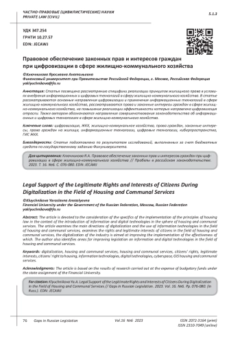 Статья посвящена рассмотрению специфики реализации принципов жилищного права в условиях внедрения информационных и цифровых технологий в сферу жилищно-коммунального хозяйства. В статье рассматриваются основные направления цифровизации и применения информационных технологий в сфере жилищно-коммунального хозяйства, рассматриваются права и законные интересы граждан в сфере жилищно-коммунального хозяйства, на повышение реализации эффективности которых направлена цифровизация отрасли. Также автором обозначаются направления совершенствования законодательства об информационных и цифровых технологиях в сфере жилищно-коммунального хозяйства.