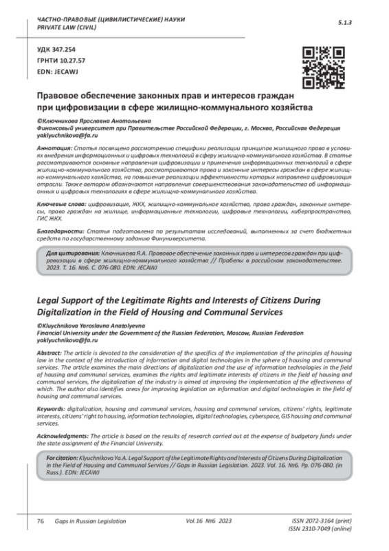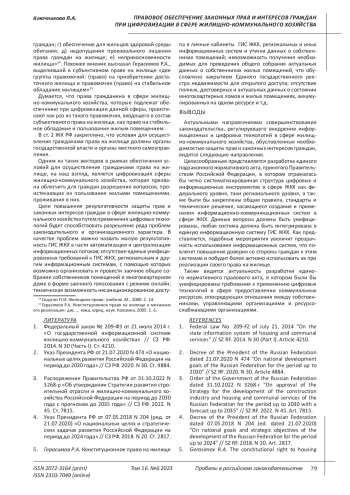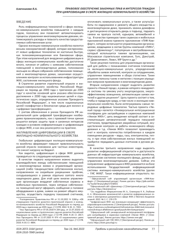 В Стратегии развития строительной отрасли и жилищно-коммунального хозяйства Российской Федерации на период до 2030 года с прогнозом до 2035 года1 в качестве основной цели указано обеспечение достижения к 2030 году национальных целей и стратегических задач, определенных указами Президента Российской Федерации2, в том числе национальных целей «комфортная и безопасная среда для жизни» и «цифровая трансформация». С учетом обозначения в указах Президента РФ национальной цели цифровой трансформации необходимо проанализировать, как с правовой точки зрения решается вопрос защиты прав и законных интересов граждан в условиях информатизации и цифровизации в сфере ЖКХ, и как она реализуются на практике.