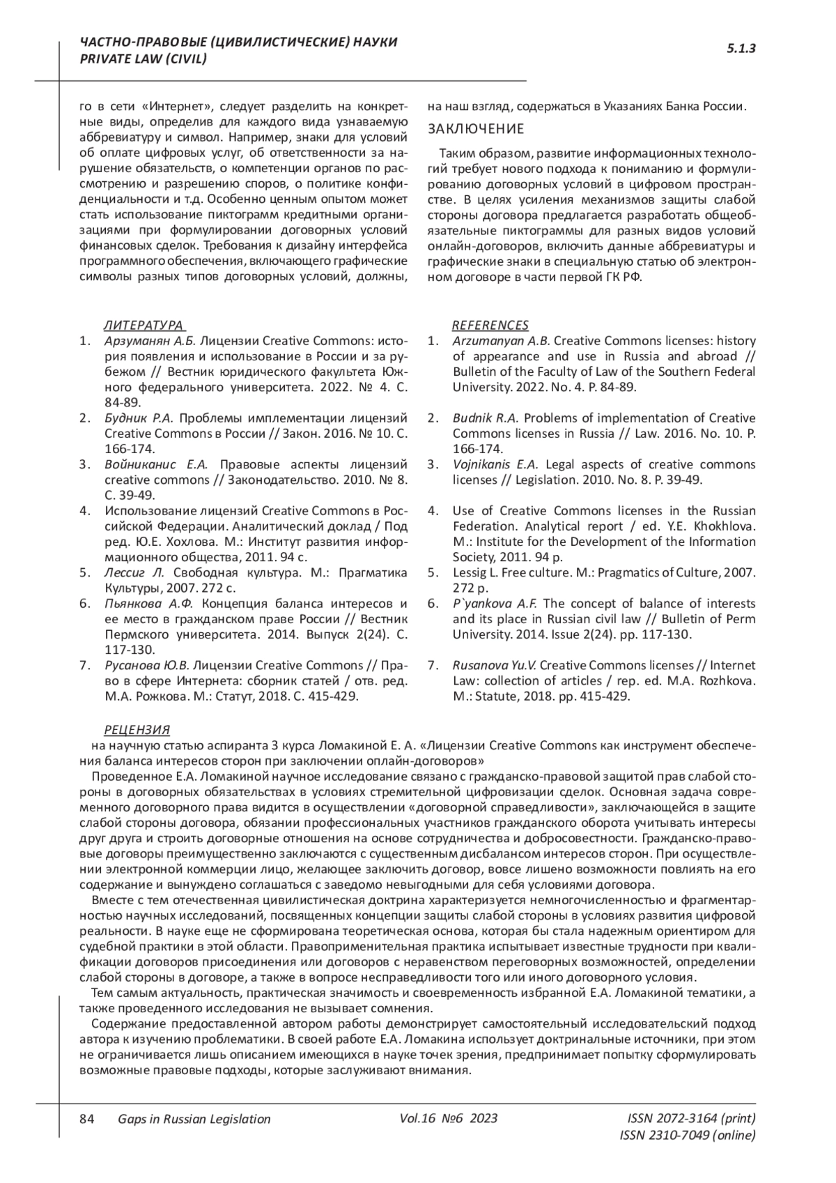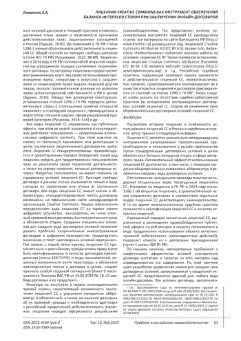 1. 	Арзуманян А.Б. Лицензии Creative Commons: история появления и использование в России и за рубежом // Вестник юридического факультета Южного федерального университета. 2022. № 4. С. 84-89. EDN: CTVVWF