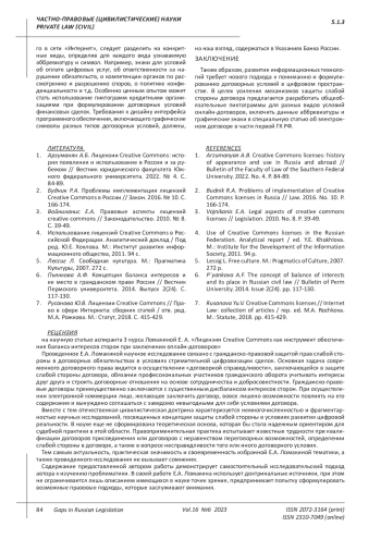 2. 	Будник Р.А. Проблемы имплементации лицензий Creative Commons в России // Закон. 2016. № 10. С. 166-174. EDN: WYMWPT
