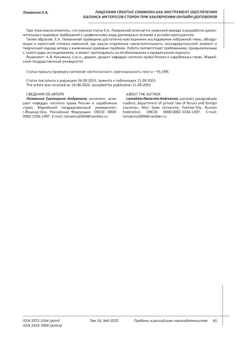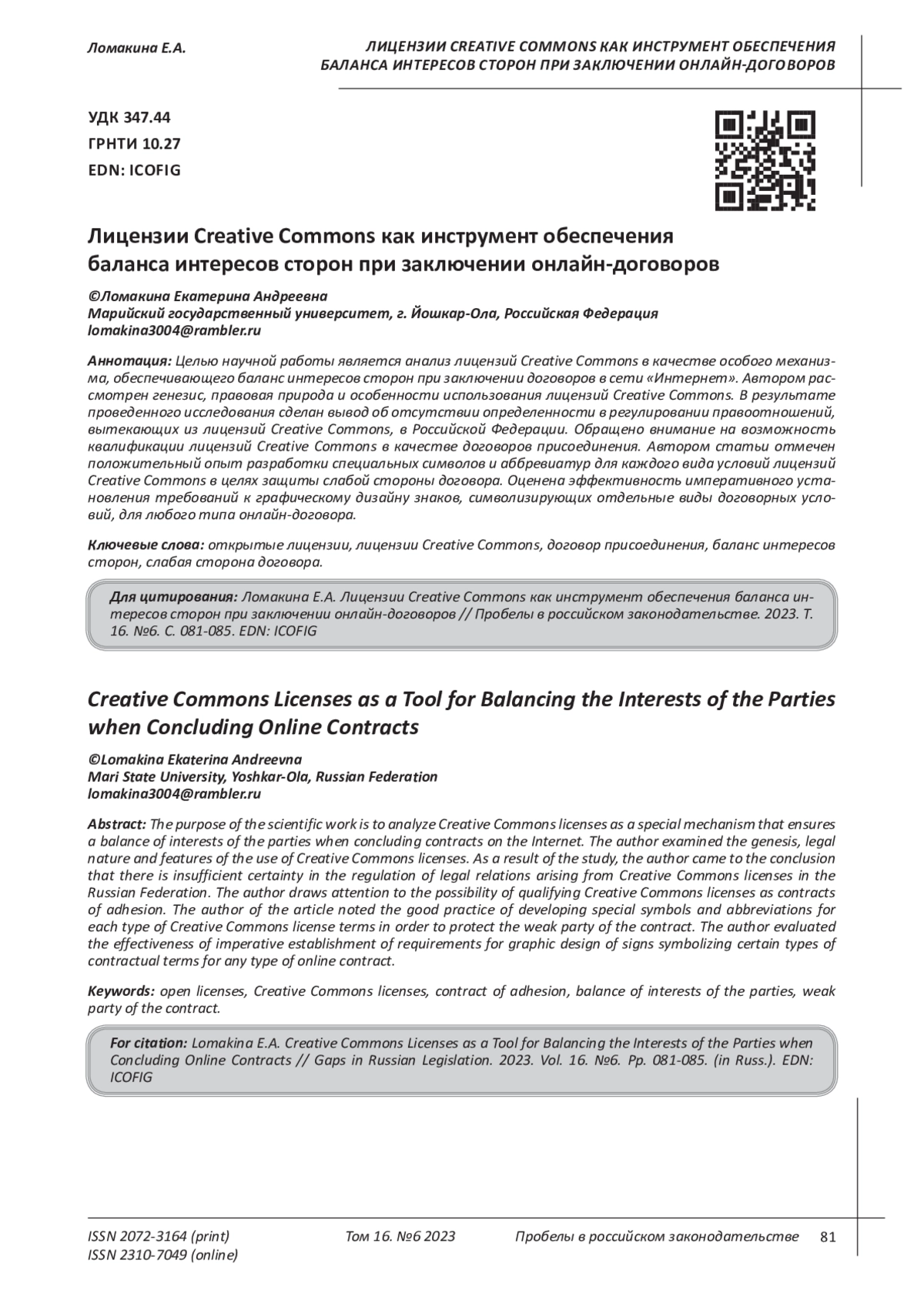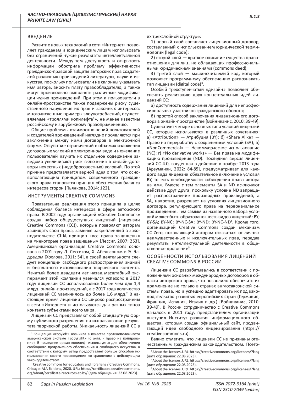 Arzumanyan A.B. Creative Commons licenses: history of appearance and use in Russia and abroad // Bulletin of the Faculty of Law of the Southern Federal University. 2022. No. 4. P. 84-89.