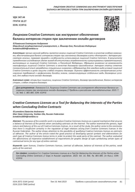 Целью научной работы является анализ лицензий Creative Commons в качестве особого механизма, обеспечивающего баланс интересов сторон при заключении договоров в сети «Интернет». Автором рассмотрен генезис, правовая природа и особенности использования лицензий Creative Commons. В результате проведенного исследования сделан вывод об отсутствии определенности в регулировании правоотношений, вытекающих из лицензий Creative Commons, в Российской Федерации. Обращено внимание на возможность квалификации лицензий Creative Commons в качестве договоров присоединения. Автором статьи отмечен положительный опыт разработки специальных символов и аббревиатур для каждого вида условий лицензий Creative Commons в целях защиты слабой стороны договора. Оценена эффективность императивного установления требований к графическому дизайну знаков, символизирующих отдельные виды договорных условий, для любого типа онлайн-договора.