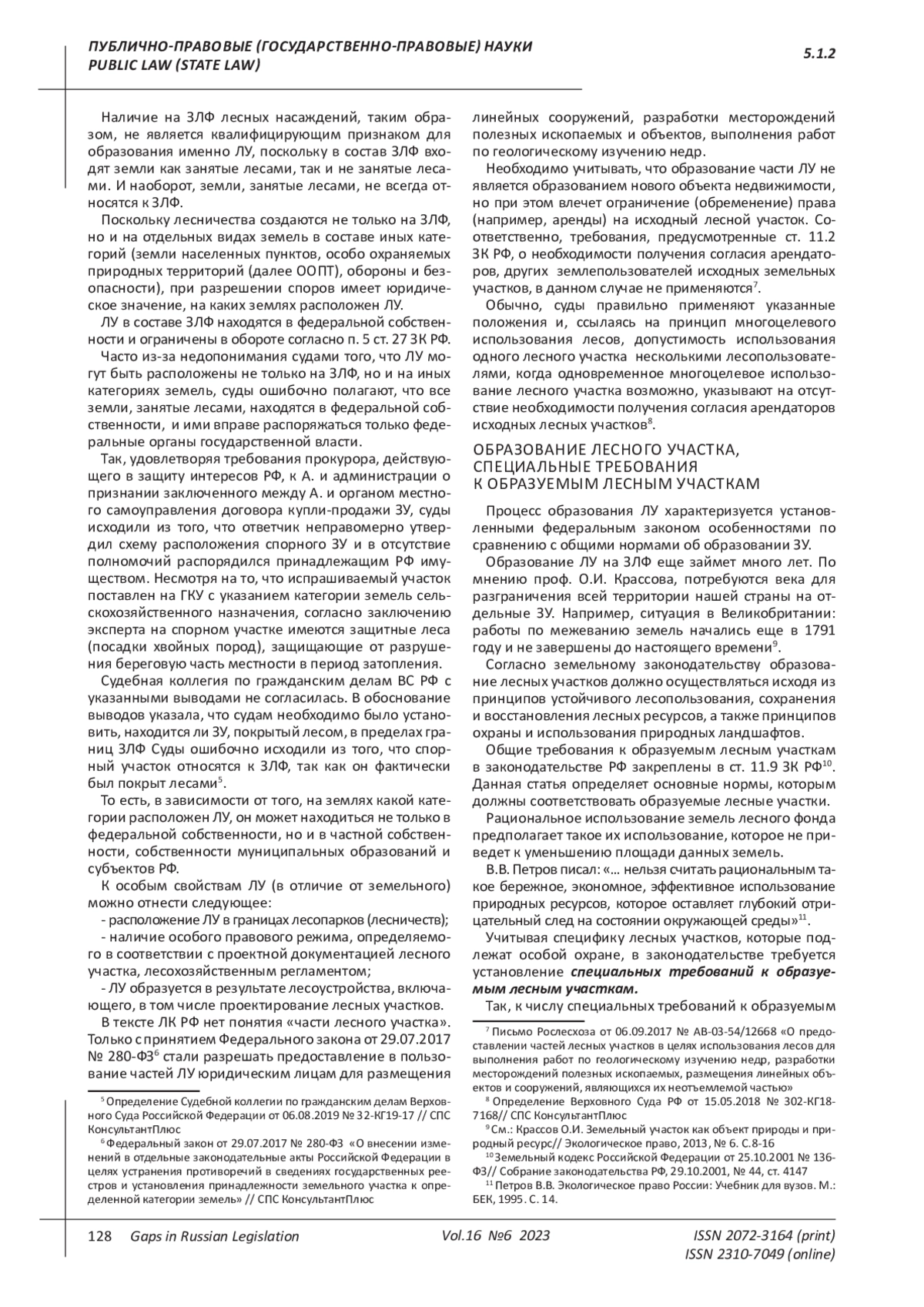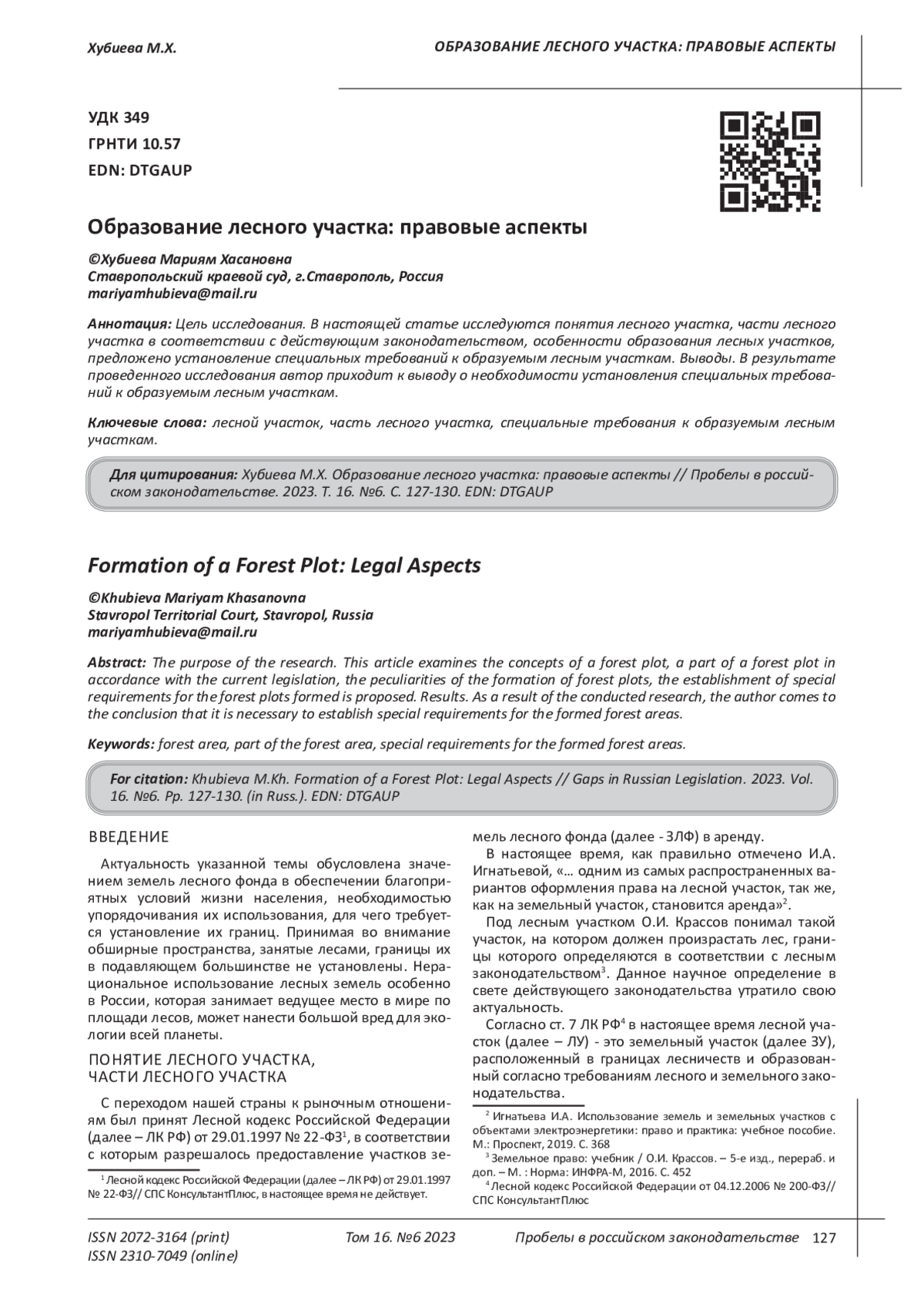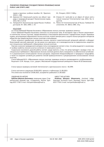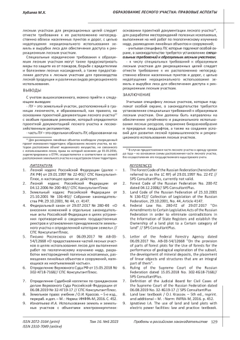 ХУБИЕВА М. Х. ОБРАЗОВАНИЕ ЛЕСНОГО УЧАСТКА: ПРАВОВЫЕ АСПЕКТЫ // ПРОБЕЛЫ В РОССИЙСКОМ ЗАКОНОДАТЕЛЬСТВЕ. 2023. Т. 16 № 6