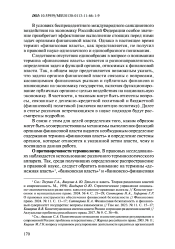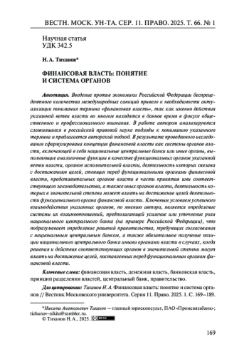Введение против экономики Российской Федерации беспрецедентного количества международных санкций привело к необходимости актуализации понимания термина «финансовая власть», так как именно действия указанной ветви власти во многом находятся в данное время в фокусе общественного и профессионального внимания. В работе автором анализируются сложившиеся в российской правовой науке подходы к пониманию указанного термина и предлагается авторский подход. В результате проведенного исследования сформулирована концепция финансовой власти как системы органов власти, включающей в себя национальные центральные банки или иные органы, выполняющие аналогичные функции в качестве функциональных органов указанной ветви власти, органов исполнительной власти, деятельность которых связана с достижениям целей, стоящих перед функциональными органами финансовой власти, представительных органов власти в части принятия ими соответствующего законодательства, а также иных органов власти, деятельность которых в значительной степени может влиять на достижение целей деятельности функционального органа финансовой власти. Ключевым условием успешного взаимодействия указанных органов, по мнению автора, является определение системы их взаимоотношений, предполагающей усиление или уточнение роли национального центрального банка (на примере Российской Федерации), что подразумевает определение решений правительства, требующих согласования с национальным центральным банком, а также обязательное получение позиции национального центрального банка иными органами власти в случаях, когда решения и действия соответствующих органов в значительной степени могут влиять на достижение целей, поставленных перед функциональным органом финансовой власти.