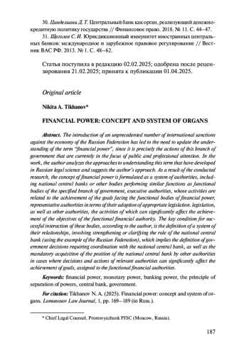 30. Цинделиани Д. Т. Центральный банк как орган, реализующий денежнокредитную политику государства // Финансовое право. 2018. № 11. С. 44-47. EDN: VLOPHP