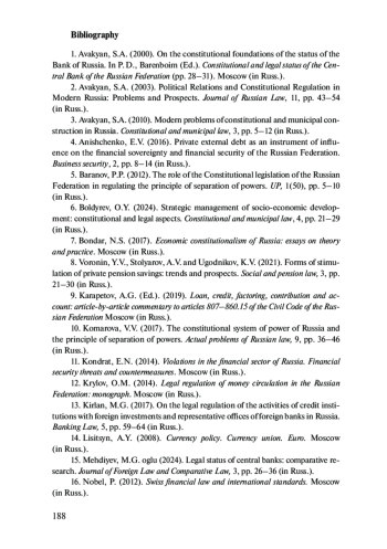 1. Авакьян С. А. О конституционных основах статуса Банка России // Конституционно-правовой статус Центрального банка Российской Федерации. М., 2000. С. 28-31.
