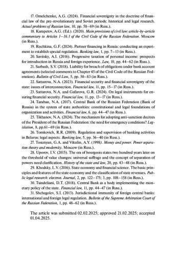15. Мехтиев М. Г. оглы. Правовой статус центральных банков: сравнительное исследование // Журнал зарубежного законодательства и сравнительного правоведения. 2024. № 3. С. 26-36. EDN: CNSYEH