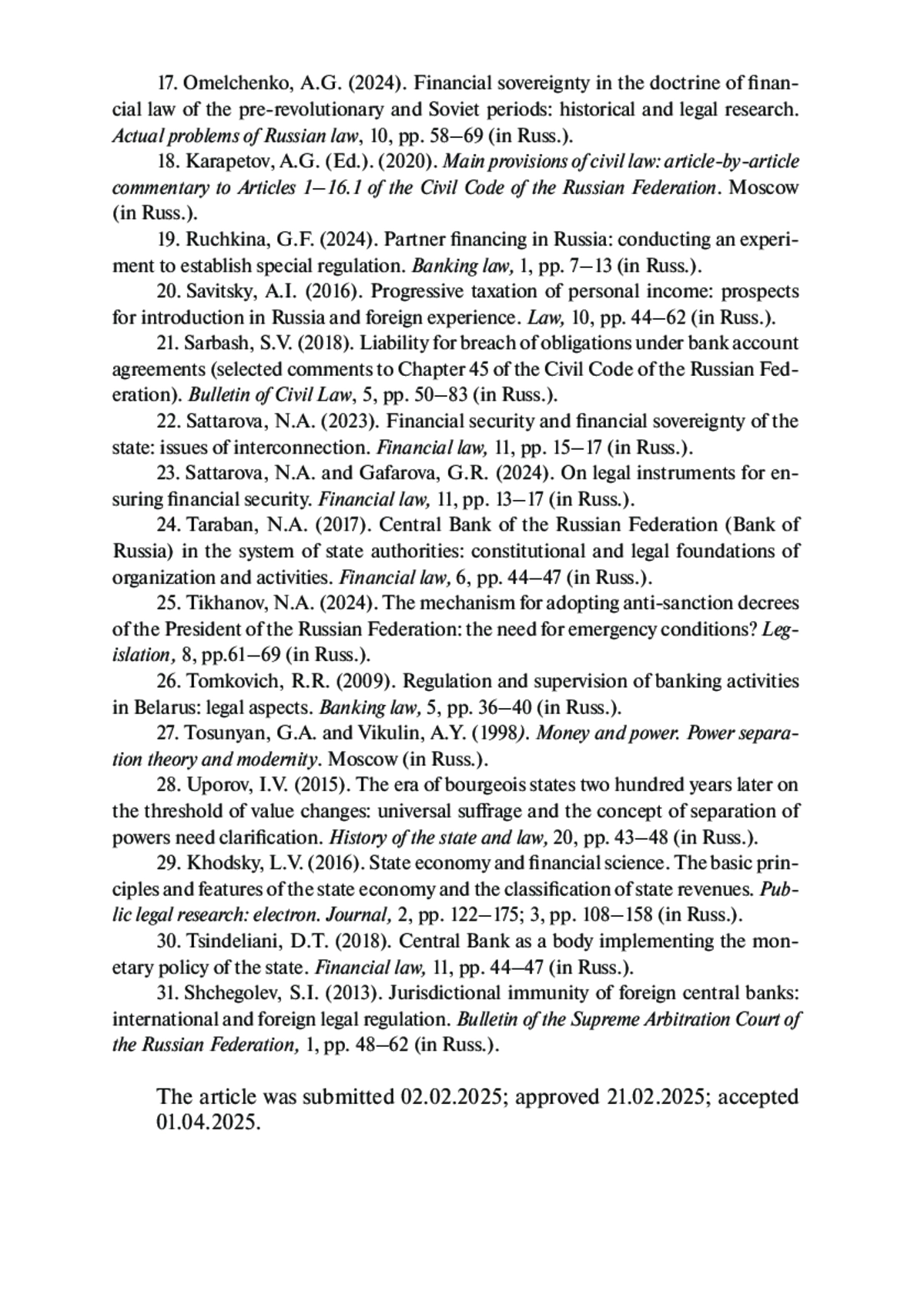 17. Омельченко А. Г. Финансовый суверенитет в доктрине финансового права дореволюционного и советского периодов: историко-правовое исследование // Актуальные проблемы российского права. 2024. № 10. С. 58-69. EDN: PHNWCL