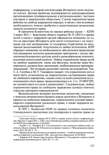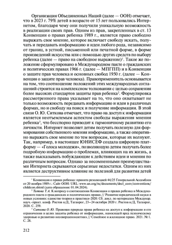 Организация Объединенных Наций (далее — ООН) отмечает, что в 2023 г. 79% детей в возрасте от 15 лет пользовались Интернетом, благодаря чему они получили уникальную возможность в реализации своих прав. Одним из прав, закрепленных в ст. 13 Конвенции о правах ребенка 1989 г., является право свободно выражать свое мнение, которое включает свободу искать, получать и передавать информацию и идеи любого рода, независимо от границ, в устной, письменной или печатной форме, в форме произведений искусства или с помощью других средств по выбору ребенка (далее — право на свободное выражение).
