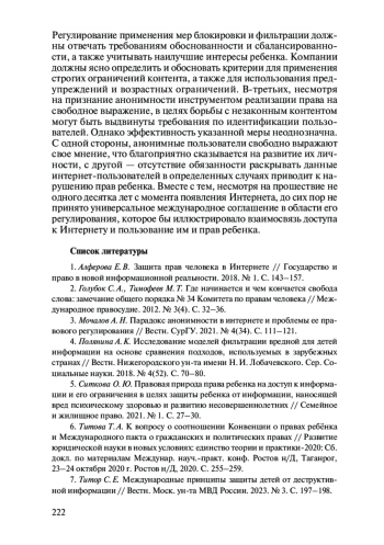 5. Ситкова О. Ю. Правовая природа права ребенка на доступ к информации и его ограничения в целях защиты ребенка от информации, наносящей вред психическому здоровью и развитию несовершеннолетних // Семейное и жилищное право. 2021. № 1. С. 27-30. EDN: EKQQDL