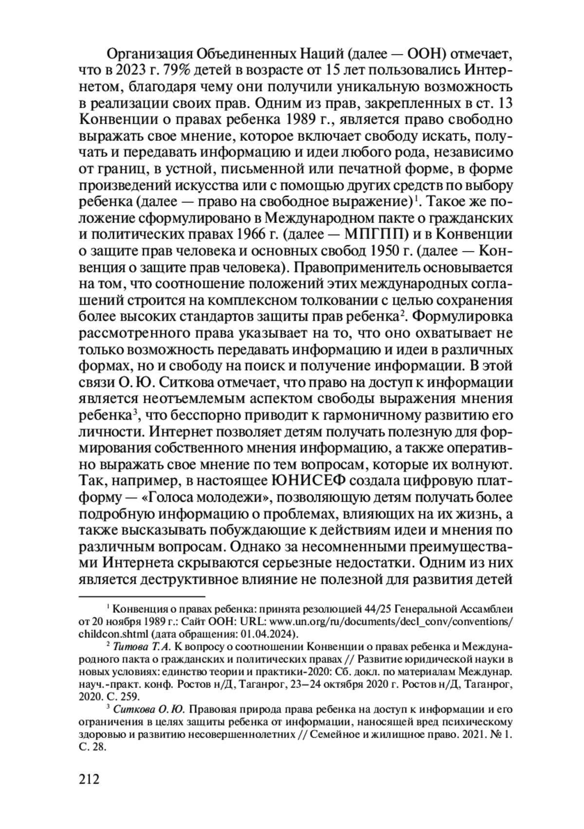 6. Титова Т. А. К вопросу о соотношении Конвенции о правах ребёнка и Международного пакта о гражданских и политических правах // Развитие юридической науки в новых условиях: единство теории и практики-2020: Сб. докл. по материалам Междунар. науч.-практ. конф. Ростов н/Д, Таганрог, 23-24 октября 2020 г. Ростов н/Д, 2020. С. 255-259. EDN: CMQUJS