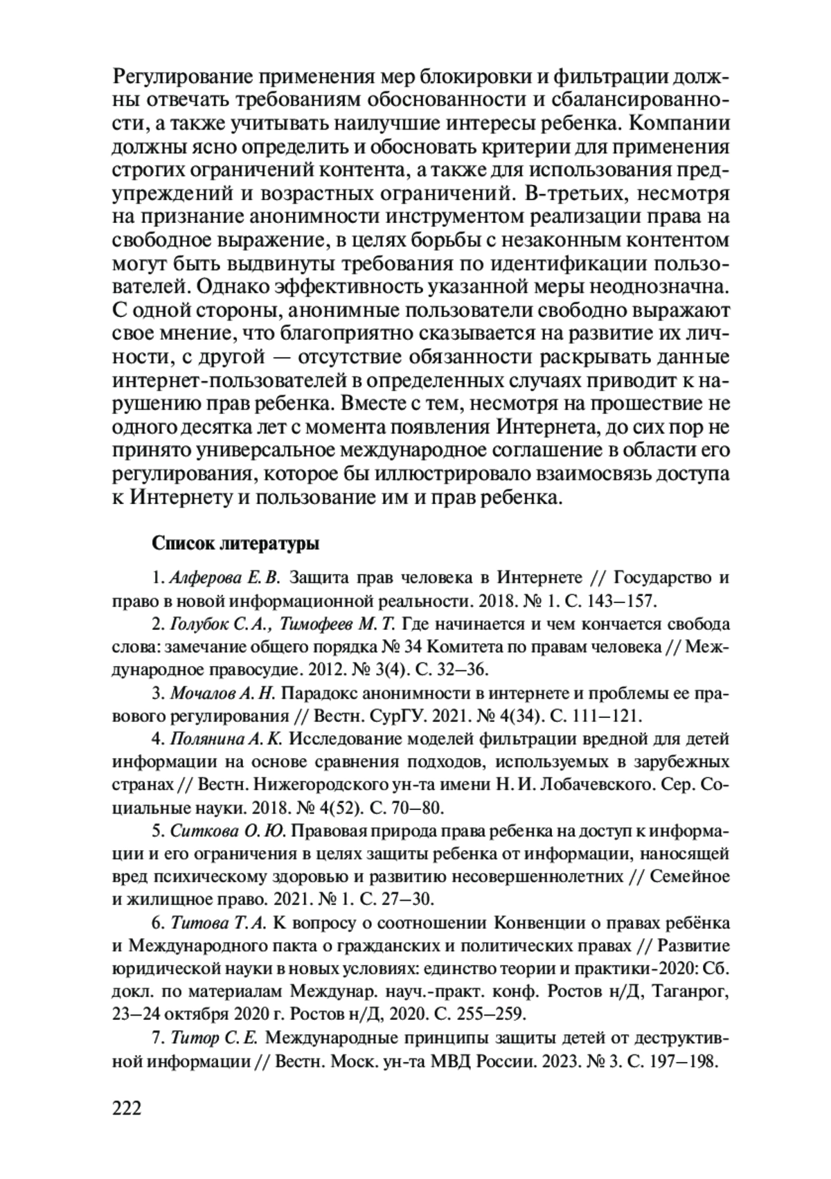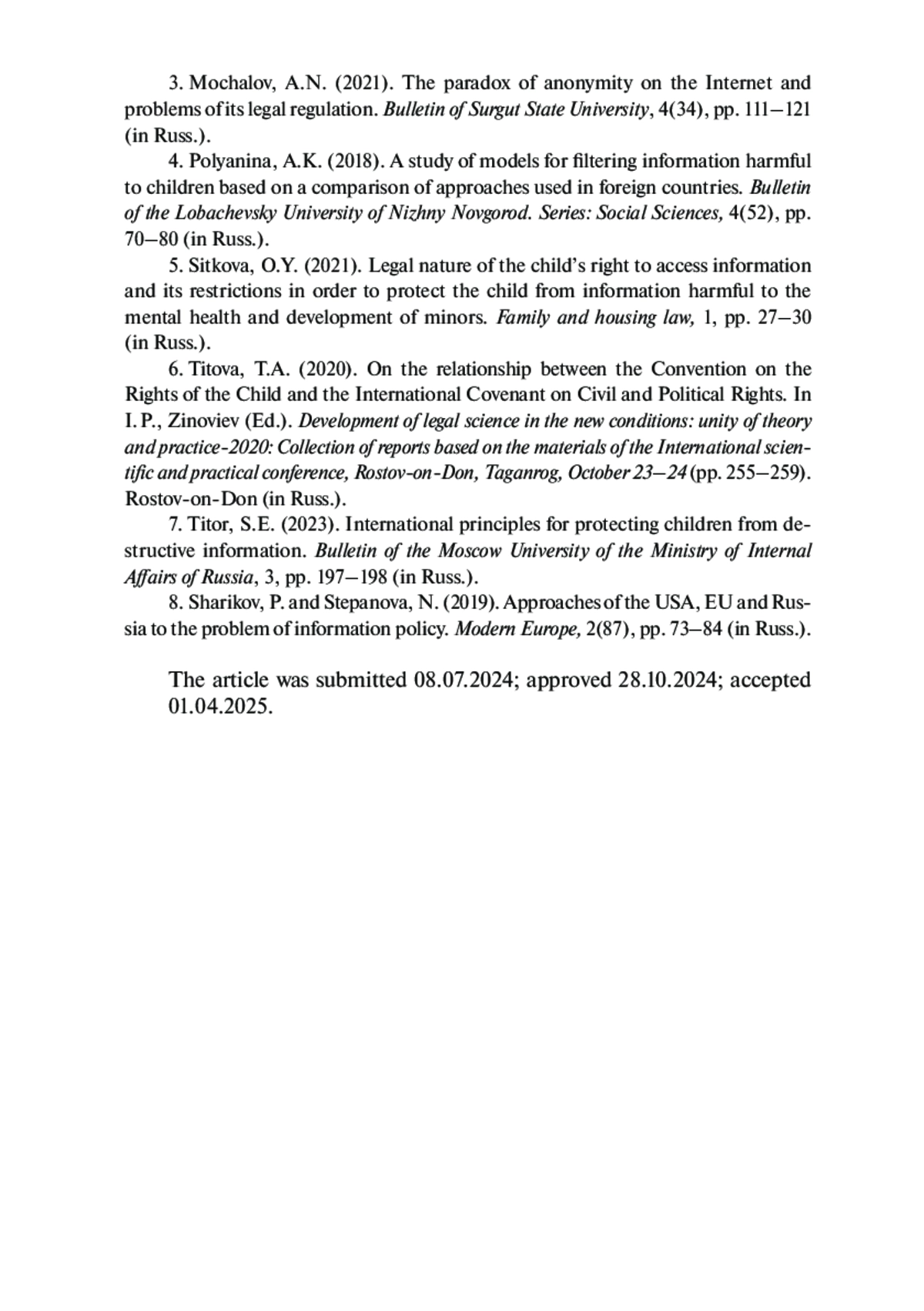 7. Титор С. Е. Международные принципы защиты детей от деструктивной информации // Вестн. Моск. ун-та МВД России. 2023. № 3. С. 197-198.