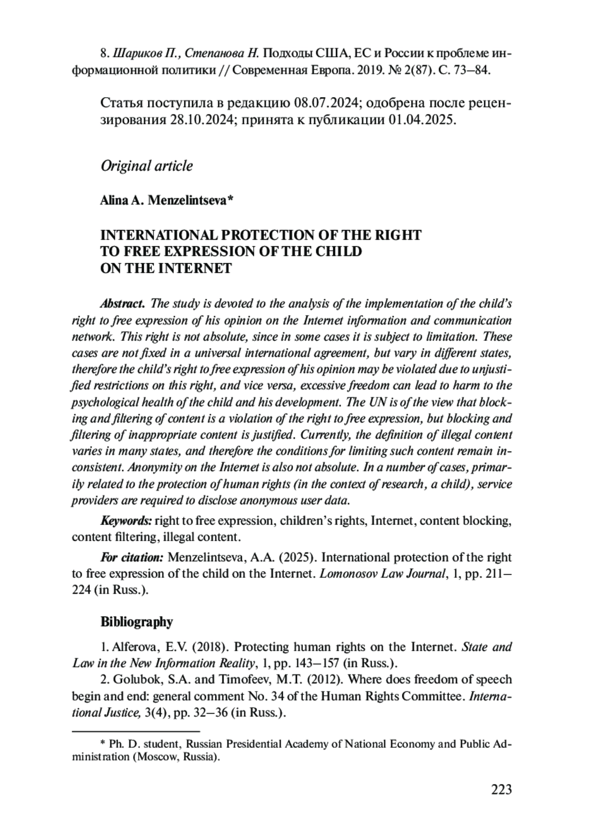 1. Алферова Е. В. Защита прав человека в Интернете // Государство и право в новой информационной реальности. 2018. № 1. С. 143-157. EDN: PZMZHU