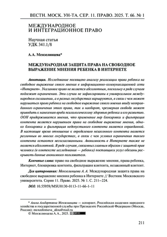 Исследование посвящено анализу реализации права ребенка на свободное выражение своего мнения в информационно-коммуникационной сети «Интернет». Указанное право не является абсолютным, поскольку в ряде случаев подлежит ограничению. Эти случаи не зафиксированы в универсальном международном соглашении, а в разных государствах варьируются, в связи с чем может нарушаться право ребенка на свободное выражение своего мнения ввиду неоправданного ограничения этого права, так и наоборот, чрезмерная свобода может приводить к нанесению вреда психологическому здоровью ребенка и его развитию. ООН придерживается мнения, что применение мер блокировки и фильтрация контента является нарушением права на свободное выражение мнения, однако блокировка и фильтрация недопустимого контента является оправданной. В настоящее время отношение к определению незаконного контента является различным во многих государствах, в связи с чем условия ограничения такого контента остаются несогласованными. Анонимность в Интернете также не является абсолютной. В ряде случаев, связанных главным образом с защитой прав человека (в контексте исследования - ребенка) поставщики услуг обязаны раскрывать данные анонимного пользователя.