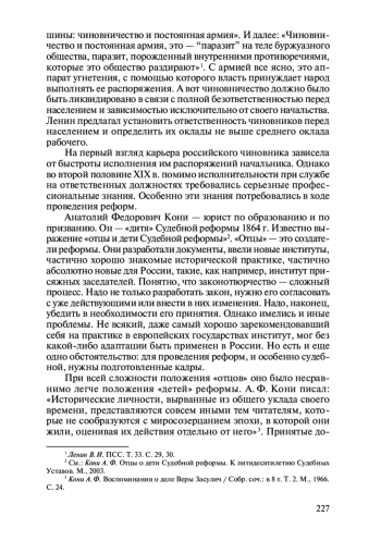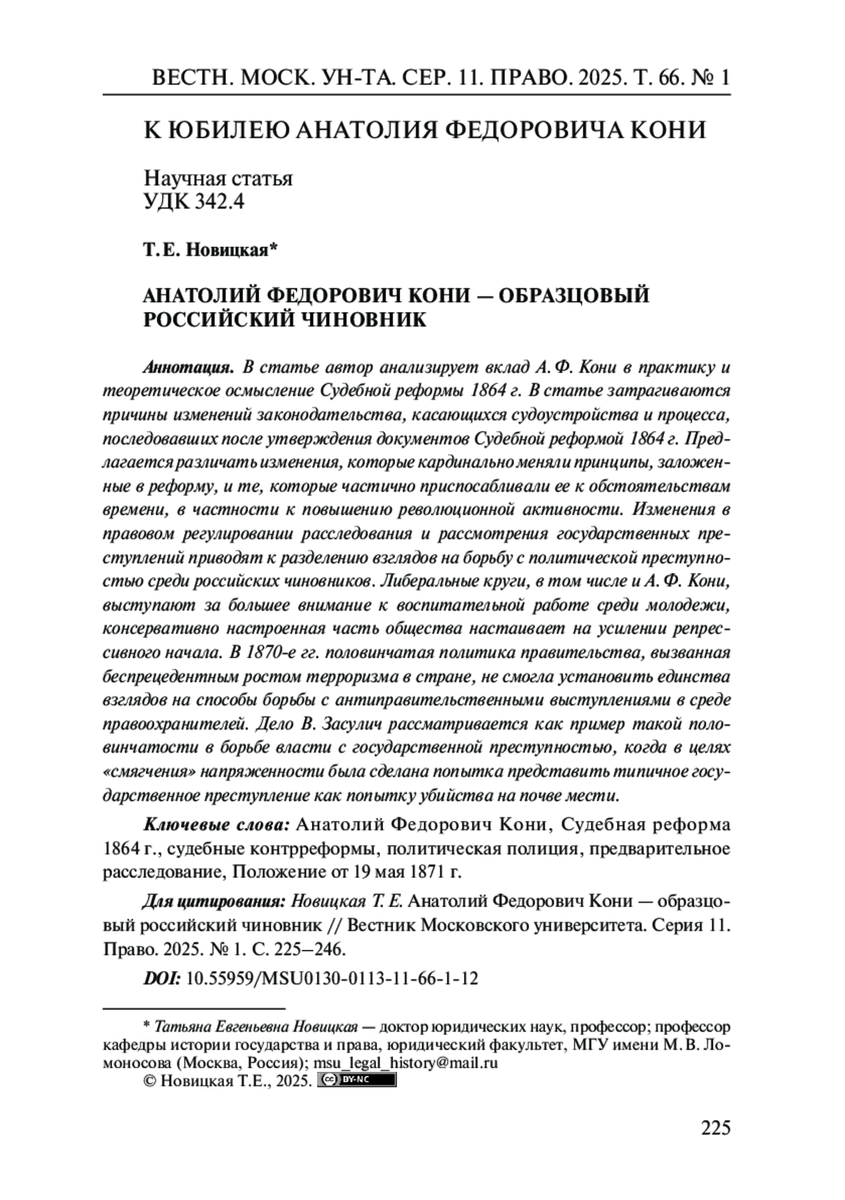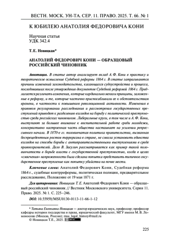 В статье автор анализирует вклад А. Ф. Кони в практику и теоретическое осмысление Судебной реформы 1864 г. В статье затрагиваются причины изменений законодательства, касающихся судоустройства и процесса, последовавших после утверждения документов Судебной реформой 1864 г. Предлагается различать изменения, которые кардинально меняли принципы, заложенные в реформу, и те, которые частично приспосабливали ее к обстоятельствам времени, в частности к повышению революционной активности. Изменения в правовом регулировании расследования и рассмотрения государственных преступлений приводят к разделению взглядов на борьбу с политической преступностью среди российских чиновников. Либеральные круги, в том числе и А. Ф. Кони, выступают за большее внимание к воспитательной работе среди молодежи, консервативно настроенная часть общества настаивает на усилении репрессивного начала. В 1870-е гг. половинчатая политика правительства, вызванная беспрецедентным ростом терроризма в стране, не смогла установить единства взглядов на способы борьбы с антиправительственными выступлениями в среде правоохранителей. Дело В. Засулич рассматривается как пример такой половинчатости в борьбе власти с государственной преступностью, когда в целях «смягчения» напряженности была сделана попытка представить типичное государственное преступление как попытку убийства на почве мести.