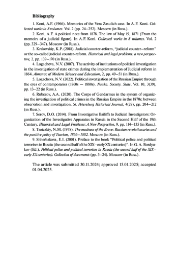 5. Логачева Н. В. Политический сыск Российской империи глазами современников (1860-е - 1880-е гг.) // Наука. Общество. Государство. 2022. Т. 10.№ 3 (39). С. 13-22. EDN: CROFKE