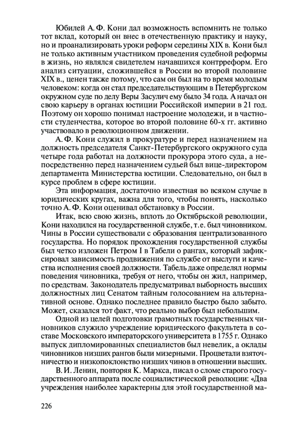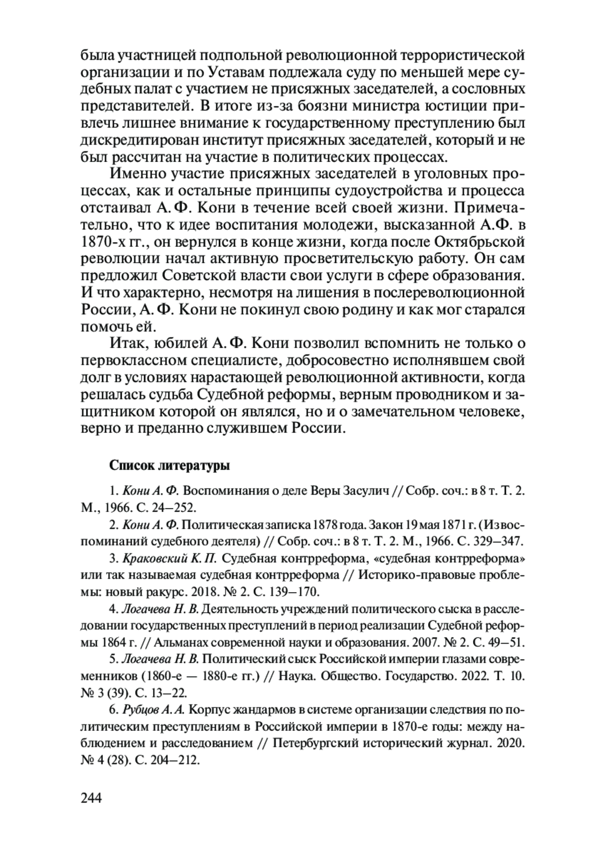 Юбилей А. Ф. Кони дал возможность вспомнить не только тот вклад, который он внес в отечественную практику и науку, но и проанализировать уроки реформ середины XIX в. Кони был не только активным участником проведения судебной реформы в жизнь, но являлся свидетелем начавшихся контрреформ. Его анализ ситуации, сложившейся в России во второй половине XIX в., ценен также потому, что сам он был на то время молодым человеком: когда он стал председательствующим в Петербургском окружном суде по делу Веры Засулич ему было 34 года. А начал он свою карьеру в органах юстиции Российской империи в 21 год. Поэтому он хорошо понимал настроение молодежи, и в частности студенчества, которое во второй половине 60-х гг. активно участвовало в революционном движении.