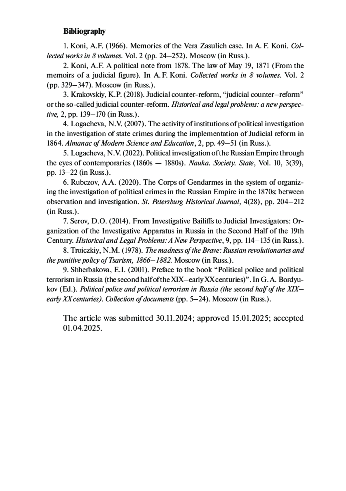 7. Серов Д. О. От следственных приставов к судебным следователям: организация следственного аппарата России во второй половине XIX века // Историко-правовые проблемы: новый ракурс. 2014. № 9. С. 114-135. EDN: SQBBUX