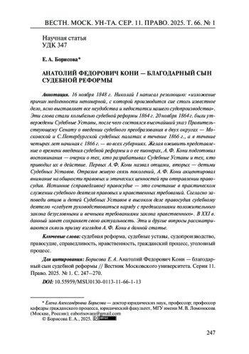 В статье автор анализирует вклад А. Ф. Кони в практику и теоретическое осмысление Судебной реформы 1864 г. В статье затрагиваются причины изменений законодательства, касающихся судоустройства и процесса, последовавших после утверждения документов Судебной реформой 1864 г. Предлагается различать изменения, которые кардинально меняли принципы, заложенные в реформу, и те, которые частично приспосабливали ее к обстоятельствам времени, в частности к повышению революционной активности. Изменения в правовом регулировании расследования и рассмотрения государственных преступлений приводят к разделению взглядов на борьбу с политической преступностью среди российских чиновников. Либеральные круги, в том числе и А. Ф. Кони, выступают за большее внимание к воспитательной работе среди молодежи, консервативно настроенная часть общества настаивает на усилении репрессивного начала. В 1870-е гг. половинчатая политика правительства, вызванная беспрецедентным ростом терроризма в стране, не смогла установить единства взглядов на способы борьбы с антиправительственными выступлениями в среде правоохранителей. Дело В. Засулич рассматривается как пример такой половинчатости в борьбе власти с государственной преступностью, когда в целях «смягчения» напряженности была сделана попытка представить типичное государственное преступление как попытку убийства на почве мести.