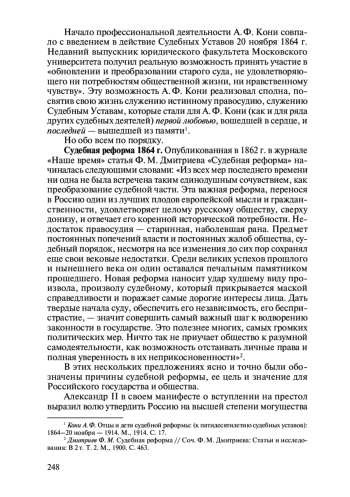 Начало профессиональной деятельности А. Ф. Кони совпало с введением в действие Судебных Уставов 20 ноября 1864 г. Недавний выпускник юридического факультета Московского университета получил реальную возможность принять участие в «обновлении и преобразовании старого суда, не удовлетворяющего ни потребностям общественной жизни, ни нравственному чувству».