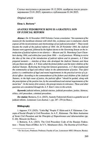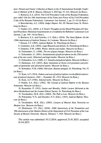 5. Васильев О. Л. Мысли А. Ф. Кони о нравственных началах уголовного процесса: исторический анахронизм или ориентир для реформ? // Вестн. Моск. ун-та. Сер. Право. 2019. № 2. С. 104-116.