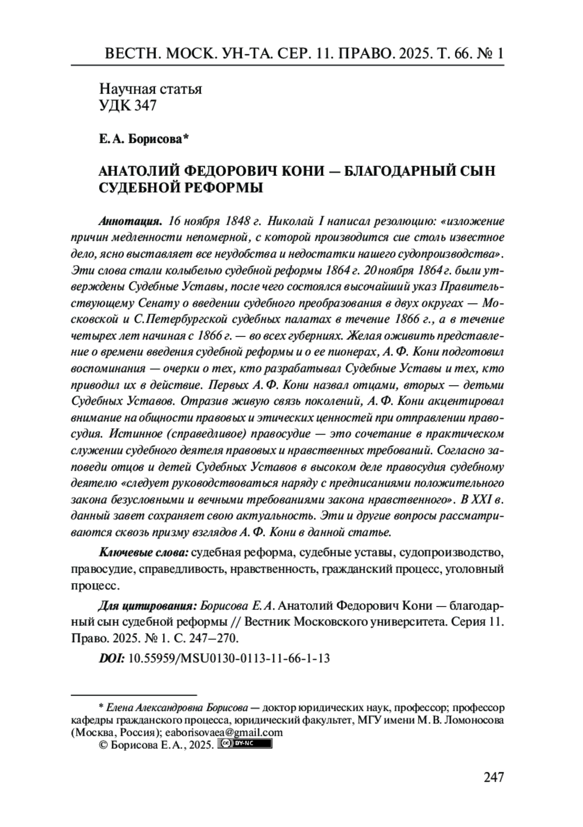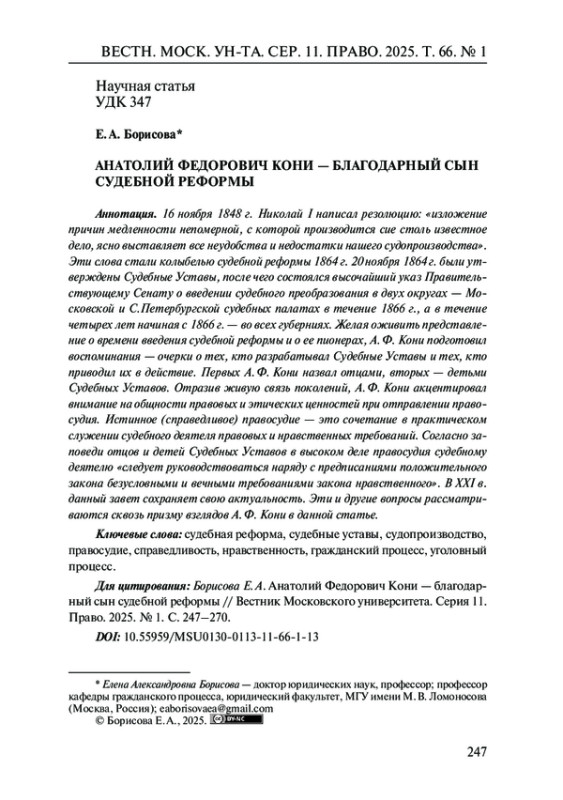 16 ноября 1848 г. Николай I написал резолюцию: «изложение причин медленности непомерной, с которой производится сие столь известное дело, ясно выставляет все неудобства и недостатки нашего судопроизводства». Эти слова стали колыбелью судебной реформы 1864 г. 20 ноября 1864 г. были утверждены Судебные Уставы, после чего состоялся высочайший указ Правительствующему Сенату о введении судебного преобразования в двух округах - Московской и С. Петербургской судебных палатах в течение 1866 г., а в течение четырех лет начиная с 1866 г. - во всех губерниях. Желая оживить представление о времени введения судебной реформы и о ее пионерах, А. Ф. Кони подготовил воспоминания - очерки о тех, кто разрабатывал Судебные Уставы и тех, кто приводил их в действие. Первых А. Ф. Кони назвал отцами, вторых - детьми Судебных Уставов. Отразив живую связь поколений, А. Ф. Кони акцентировал внимание на общности правовых и этических ценностей при отправлении правосудия. Истинное (справедливое) правосудие - это сочетание в практическом служении судебного деятеля правовых и нравственных требований. Согласно заповеди отцов и детей Судебных Уставов в высоком деле правосудия судебному деятелю «следует руководствоваться наряду с предписаниями положительного закона безусловными и вечными требованиями закона нравственного». В ХХI в. данный завет сохраняет свою актуальность. Эти и другие вопросы рассматриваются сквозь призму взглядов А. Ф. Кони в данной статье.
