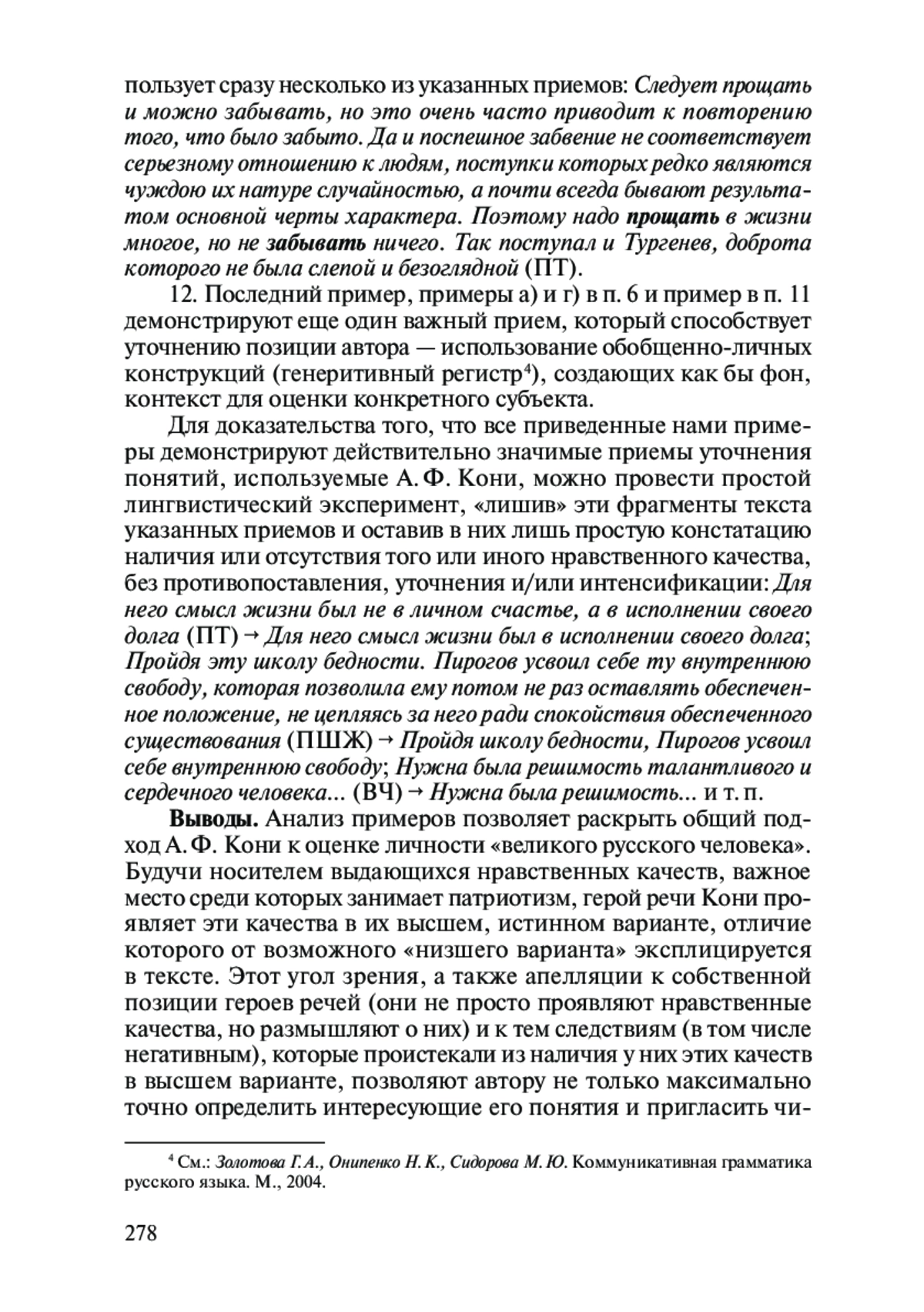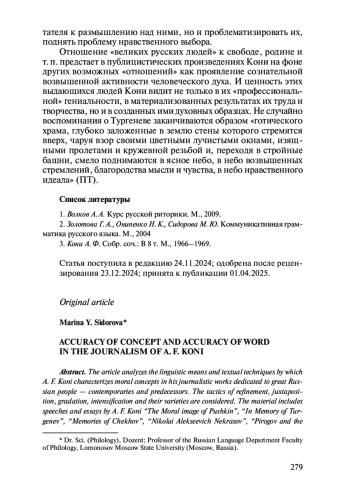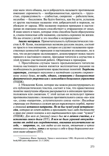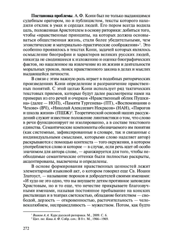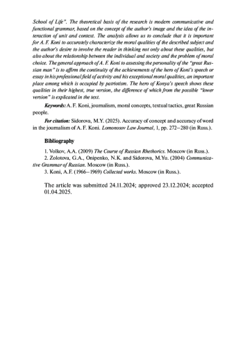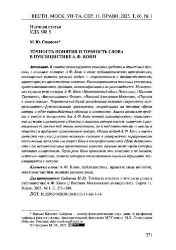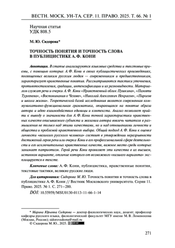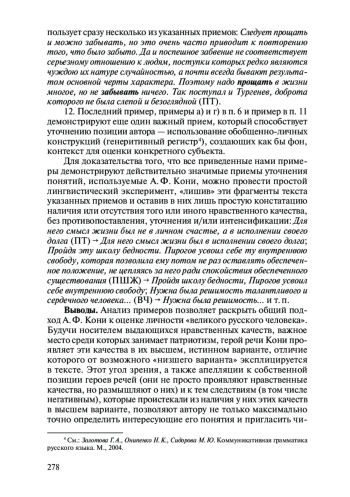 В статье анализируются языковые средства и текстовые приемы, с помощью которых А. Ф. Кони в своих публицистических произведениях, посвященных великим русским людям - современникам и предшественникам, характеризует нравственные понятия. Рассматриваются тактики уточнения, противопоставления, градации, интенсификации и их разновидности. Материалом служат речи и очерки А. Ф. Кони «Нравственный облик Пушкина», «Памяти Тургенева», «Воспоминания о Чехове», «Николай Алексеевич Некрасов», «Пирогов и школа жизни». Теоретической базой исследования является современная коммуникативно-функциональная грамматика, опирающаяся на понятие образа автора и идею взаимодействия единицы и контекста. Анализ позволяет прийти к выводу о значимости для А. Ф. Кони точной характеристики нравственных качеств описываемого субъекта и желании автора вовлечь читателя в размышления не только над этими качествами, но и над отношениями личности и общества и проблемой нравственного выбора. Общий подход А. Ф. Кони к оценке личности «великого русского человека» состоит в утверждении неразрывности достижений героя речи или очерка Кони в его профессиональной сфере деятельности и его исключительных нравственных качеств, важное место среди которых занимает патриотизм. Герой речи Кони проявляет эти качества в их высшем, истинном варианте, отличие которого от возможного «низшего варианта» эксплицируется в тексте.