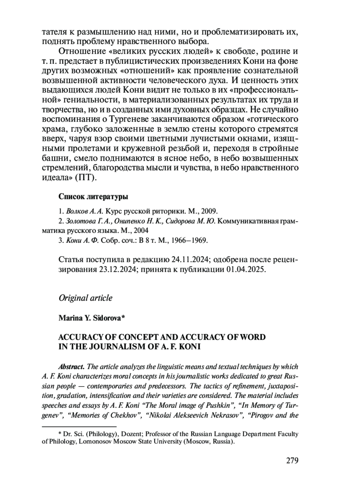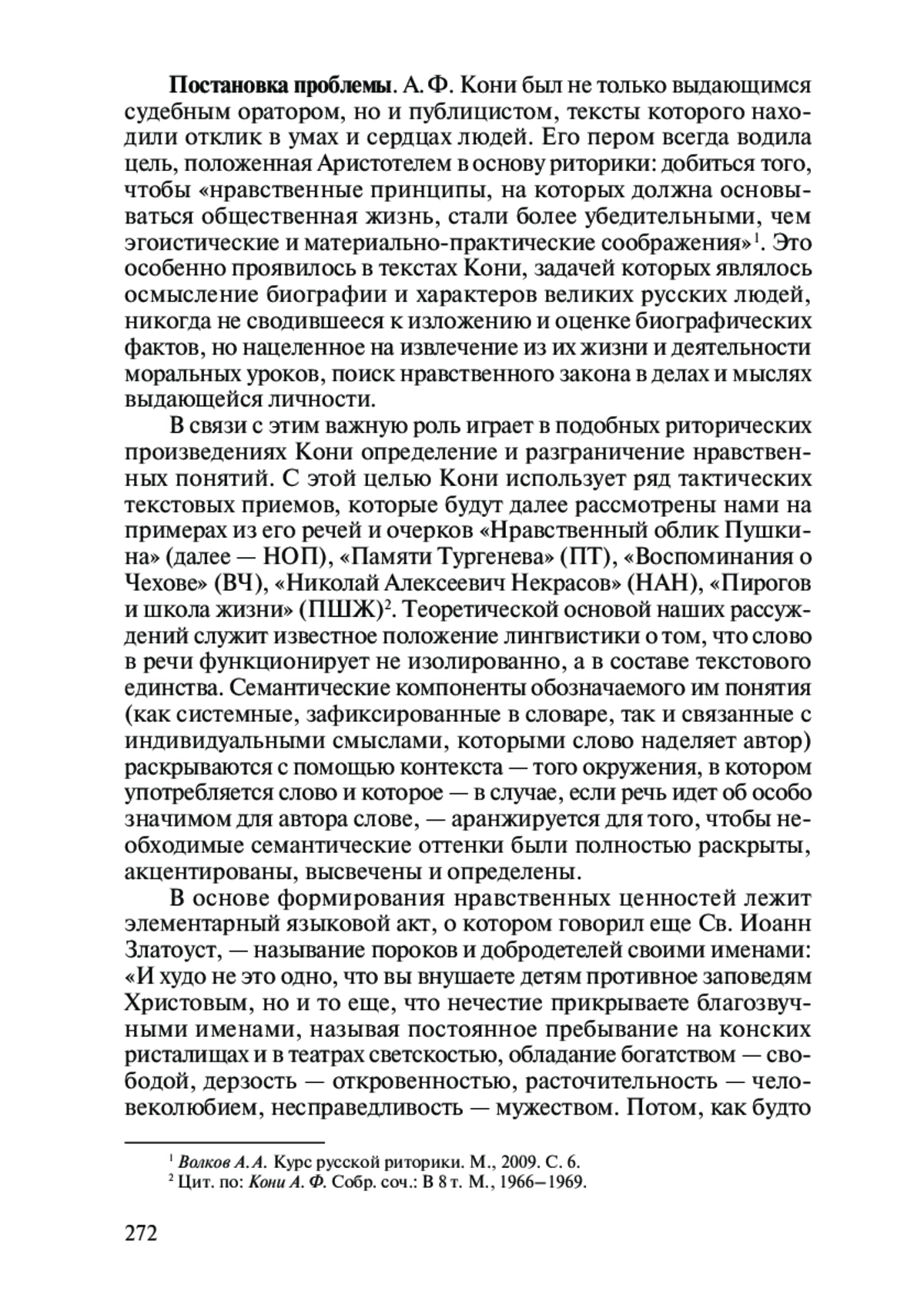 постановка проблемы. А. Ф. Кони был не только выдающимся судебным оратором, но и публицистом, тексты которого находили отклик в умах и сердцах людей. Его пером всегда водила цель, положенная Аристотелем в основу риторики: добиться того, чтобы «нравственные принципы, на которых должна основываться общественная жизнь, стали более убедительными, чем эгоистические и материально-практические соображения». Это особенно проявилось в текстах Кони, задачей которых являлось осмысление биографии и характеров великих русских людей, никогда не сводившееся к изложению и оценке биографических фактов, но нацеленное на извлечение из их жизни и деятельности моральных уроков, поиск нравственного закона в делах и мыслях выдающейся личности.