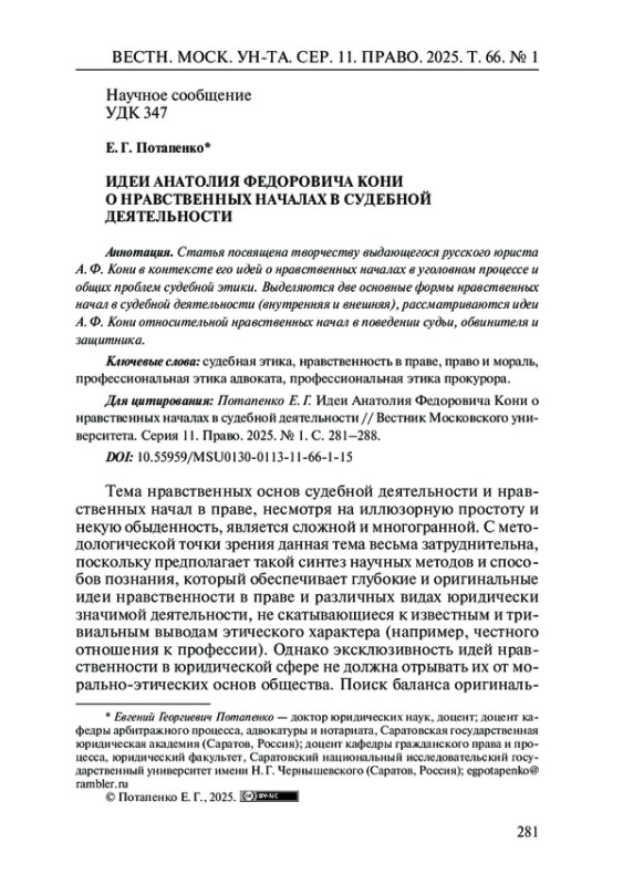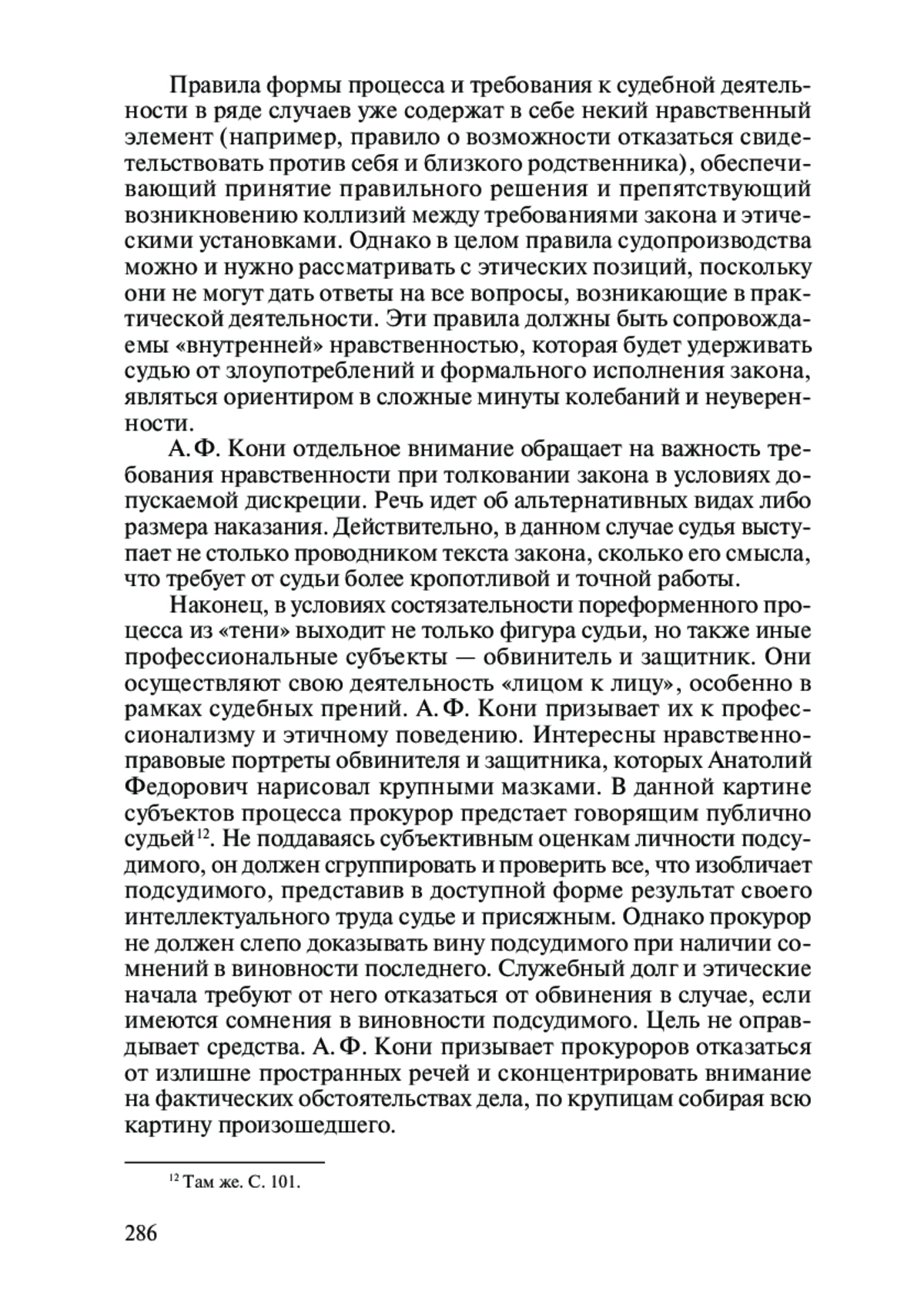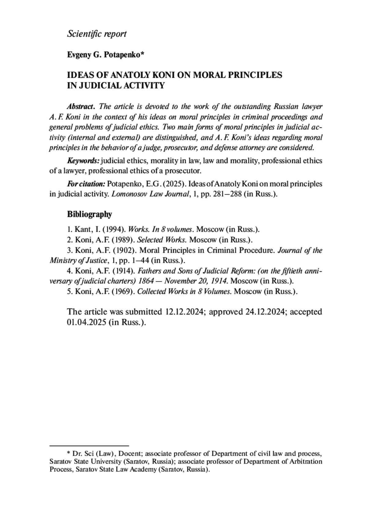 Статья посвящена творчеству выдающегося русского юриста А. Ф. Кони в контексте его идей о нравственных началах в уголовном процессе и общих проблем судебной этики. Выделяются две основные формы нравственных начал в судебной деятельности (внутренняя и внешняя), рассматриваются идеи А. Ф. Кони относительной нравственных начал в поведении судьи, обвинителя и защитника.