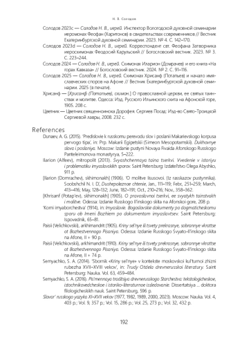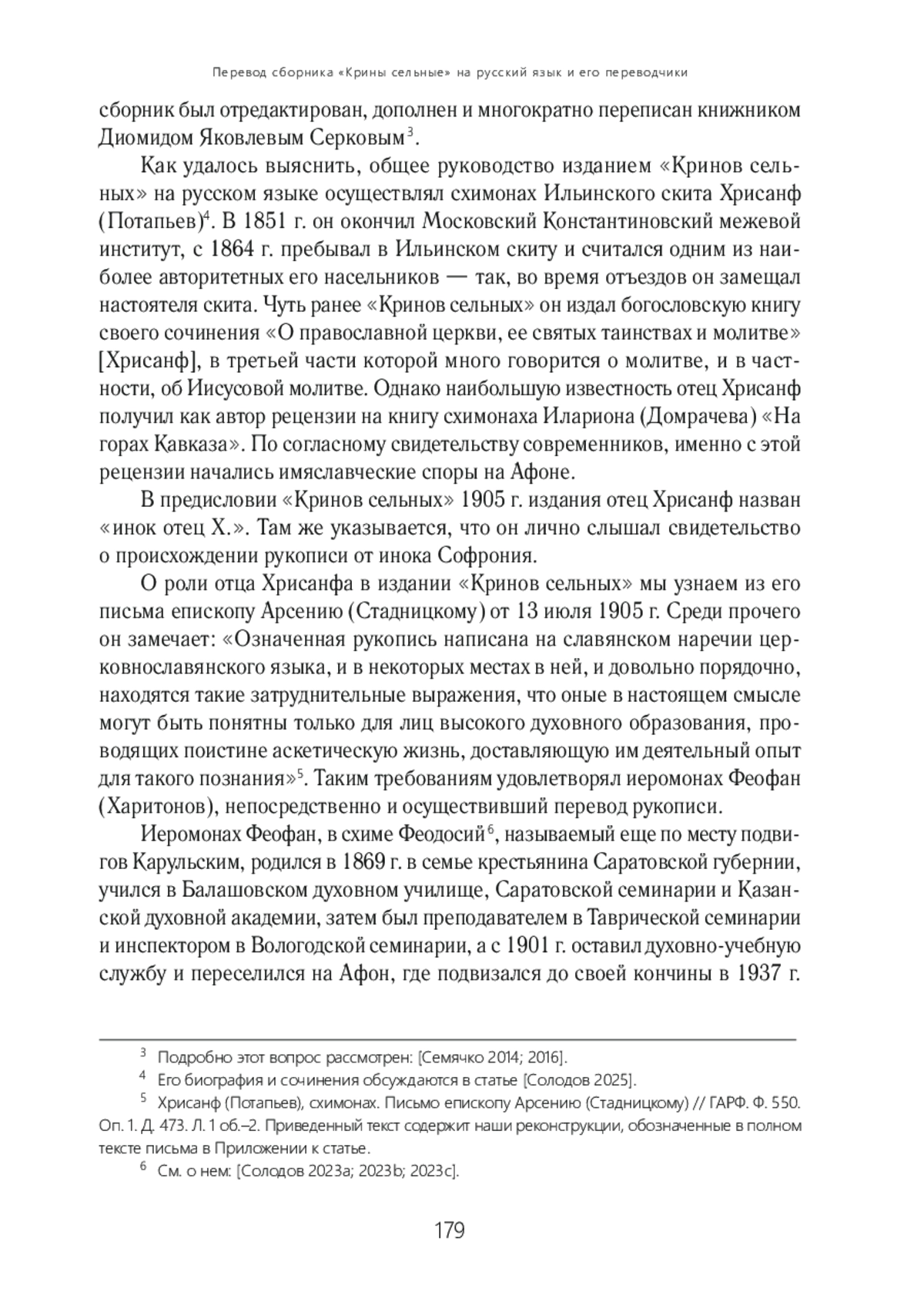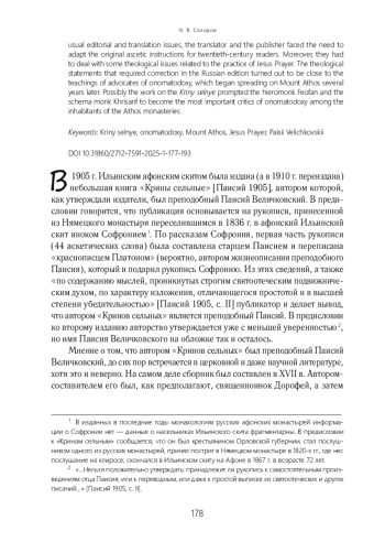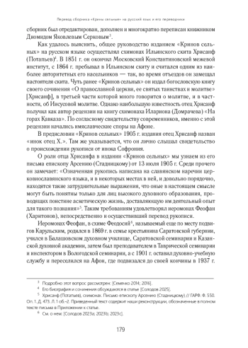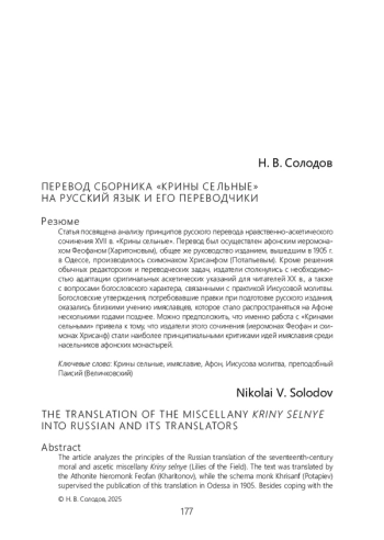 Статья посвящена анализу принципов русского перевода нравственно-аскетического сочинения XVII в. «Крины сельные». Перевод был осуществлен афонским иеромонахом Феофаном (Харитоновым), общее же руководство изданием, вышедшим в 1905 г. в Одессе, производилось схимонахом Хрисанфом (Потапьевым). Кроме решения обычных редакторских и переводческих задач, издатели столкнулись с необходимостью адаптации оригинальных аскетических указаний для читателей XX в., а также с вопросами богословского характера, связанными с практикой Иисусовой молитвы. Богословские утверждения, потребовавшие правки при подготовке русского издания, оказались близкими учению имяславцев, которое стало распространяться на Афоне несколькими годами позднее. Можно предположить, что именно работа с «Кринами сельными» привела к тому, что издатели этого сочинения (иеромонах Феофан и схимонах Хрисанф) стали наиболее принципиальными критиками идей имяславия среди насельников афонских монастырей.