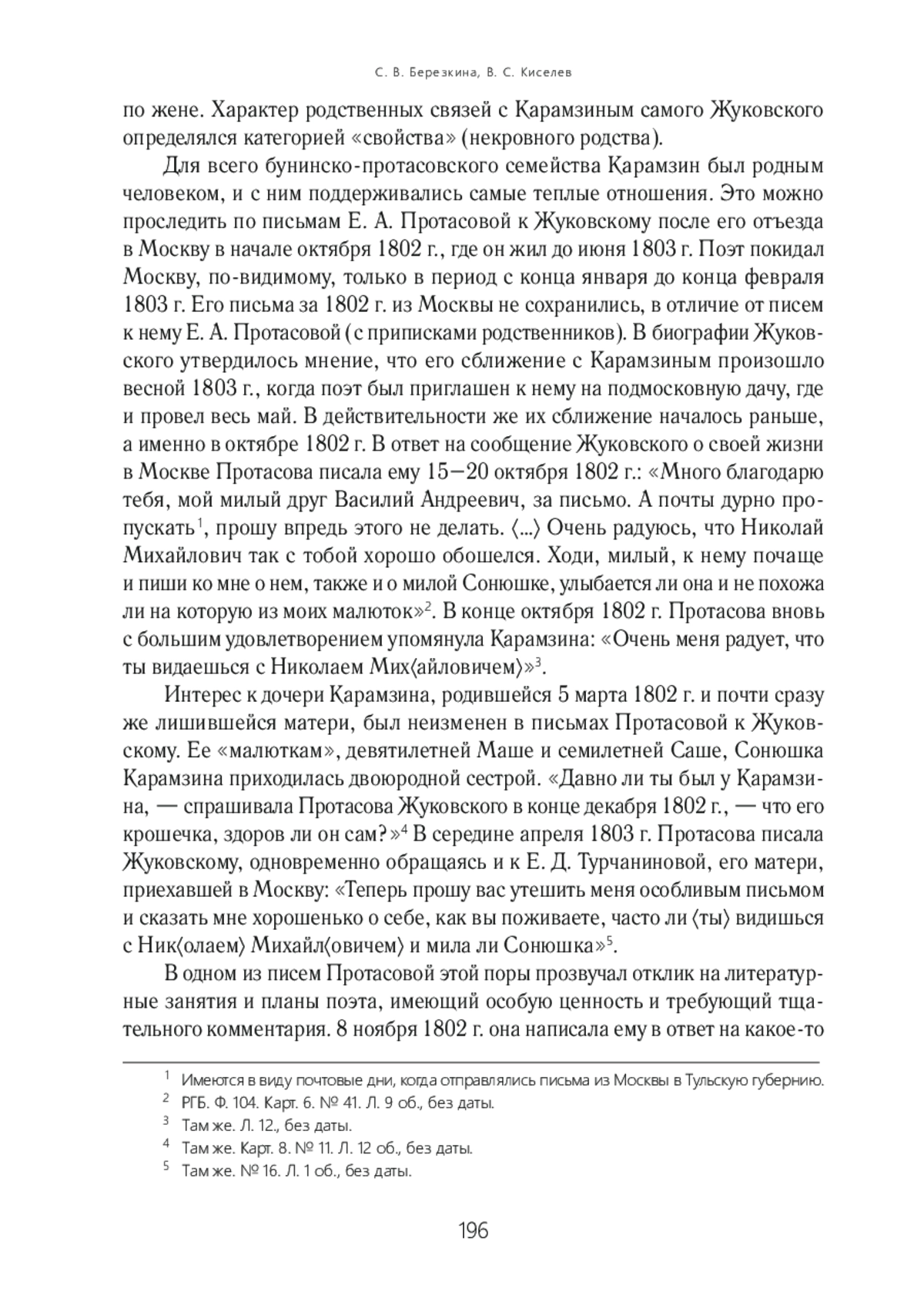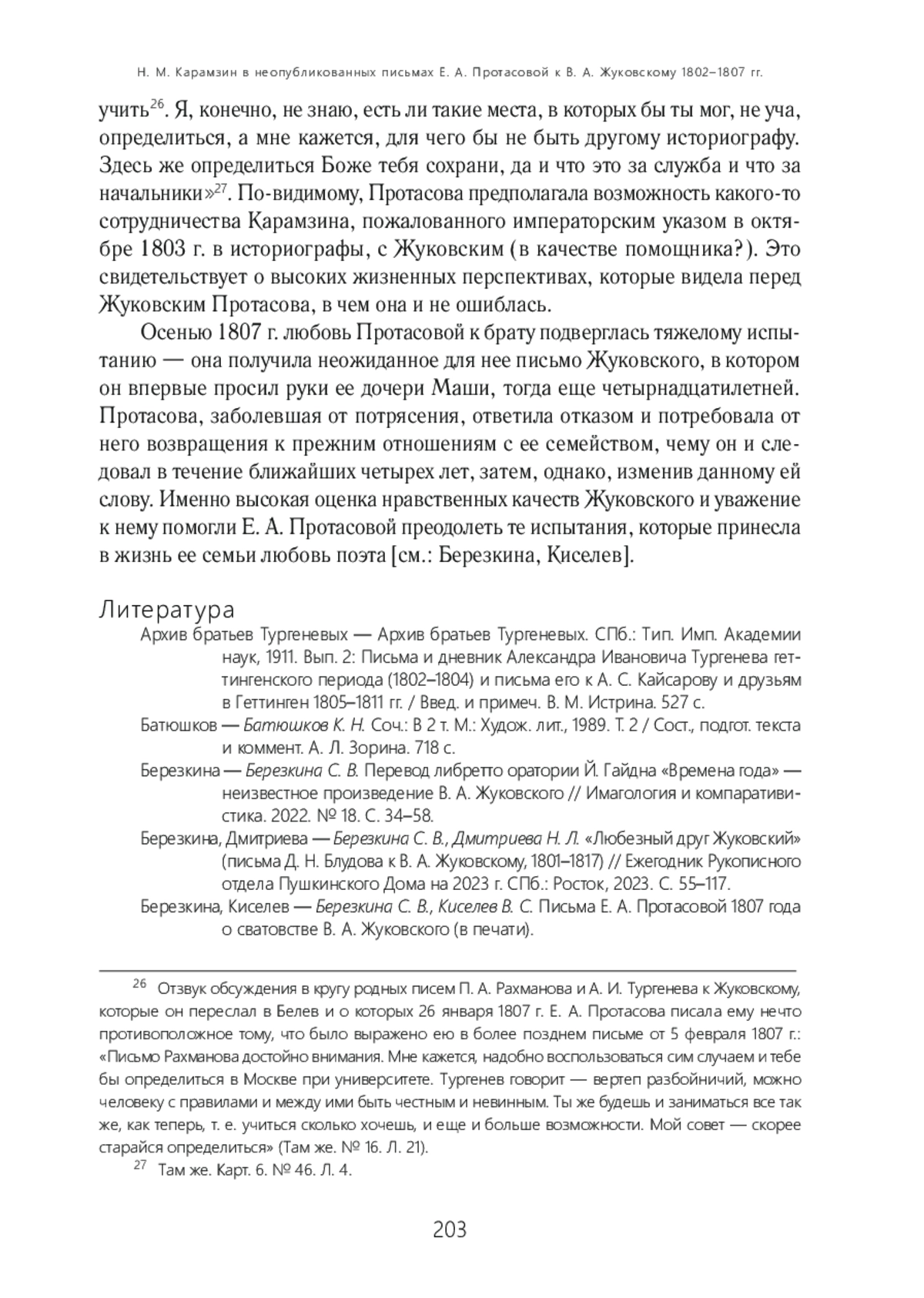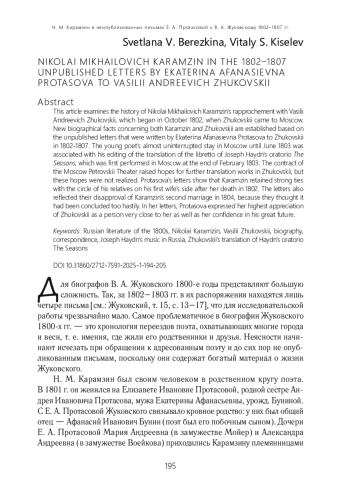 БЕРЕЗКИНА С. В., КИСЕЛЕВ В. С. Н. М. КАРАМЗИН В НЕОПУБЛИКОВАННЫХ ПИСЬМАХ Е. А. ПРОТАСОВОЙ К В. А. ЖУКОВСКОМУ 1802–1807 Г // СЛОВЕСНОСТЬ И ИСТОРИЯ. 2025. № 1