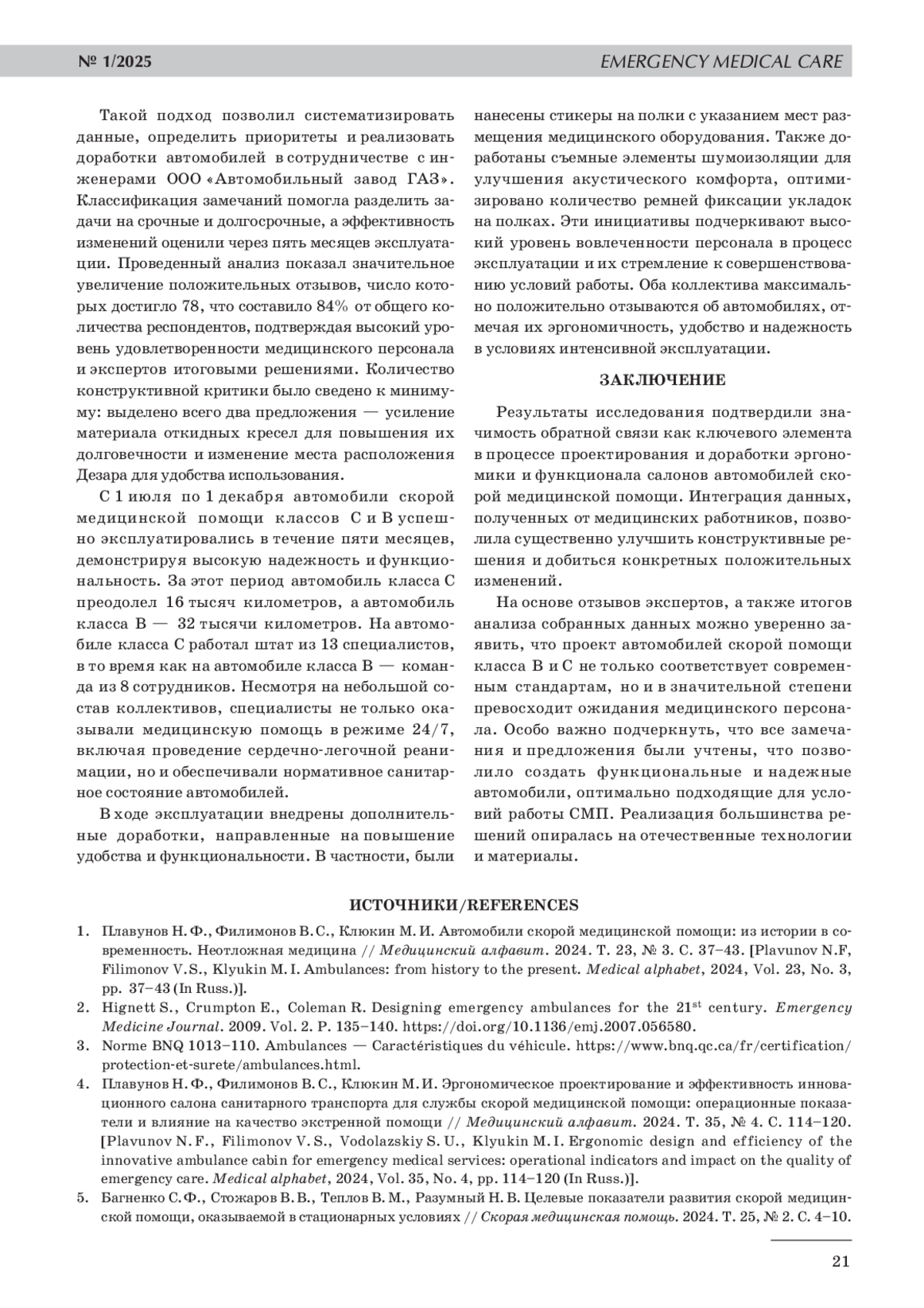 4. 	Плавунов Н. Ф., Филимонов В. С., Клюкин М. И. Эргономическое проектирование и эффективность инновационного салона санитарного транспорта для службы скорой медицинской помощи: операционные показатели и влияние на качество экстренной помощи // Медицинский алфавит. 2024. Т. 35, № 4. С. 114-120.