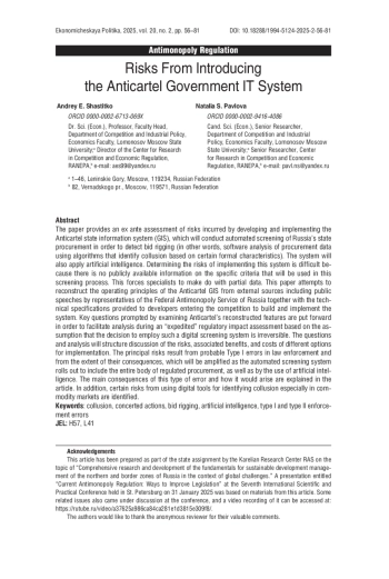 11. Avdasheva S., Golovanova S., Korneeva D. Distorting Effects of Competition Authority’s Performance Measurement: The Case of Russia // International Journal of Public Sector Management. 2016. Vol. 29. No 3. P. 288-306.