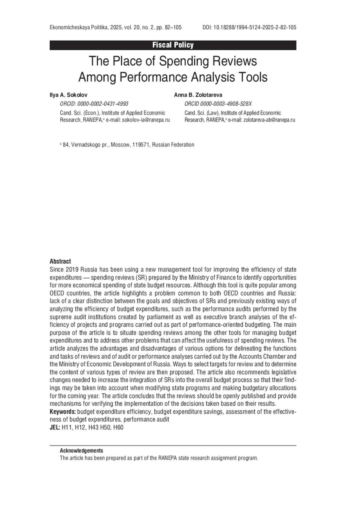 СОКОЛОВ И. А., ЗОЛОТАРЕВА А. Б. МЕСТО ОБЗОРОВ БЮДЖЕТНЫХ РАСХОДОВ СРЕДИ ИНСТРУМЕНТОВ АНАЛИЗА ЭФФЕКТИВНОСТИ // ЭКОНОМИЧЕСКАЯ ПОЛИТИКА. 2025. ТОМ 20, № 2