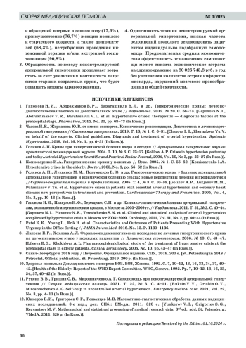 7. Patel К. К., Young L., Erik H. et al. Characteristics and Outcomes of Patients Presenting With Hypertensive Urgency in the Office Setting // JAMA Intern Med. 2016. No. 13. P. 1130-1136.