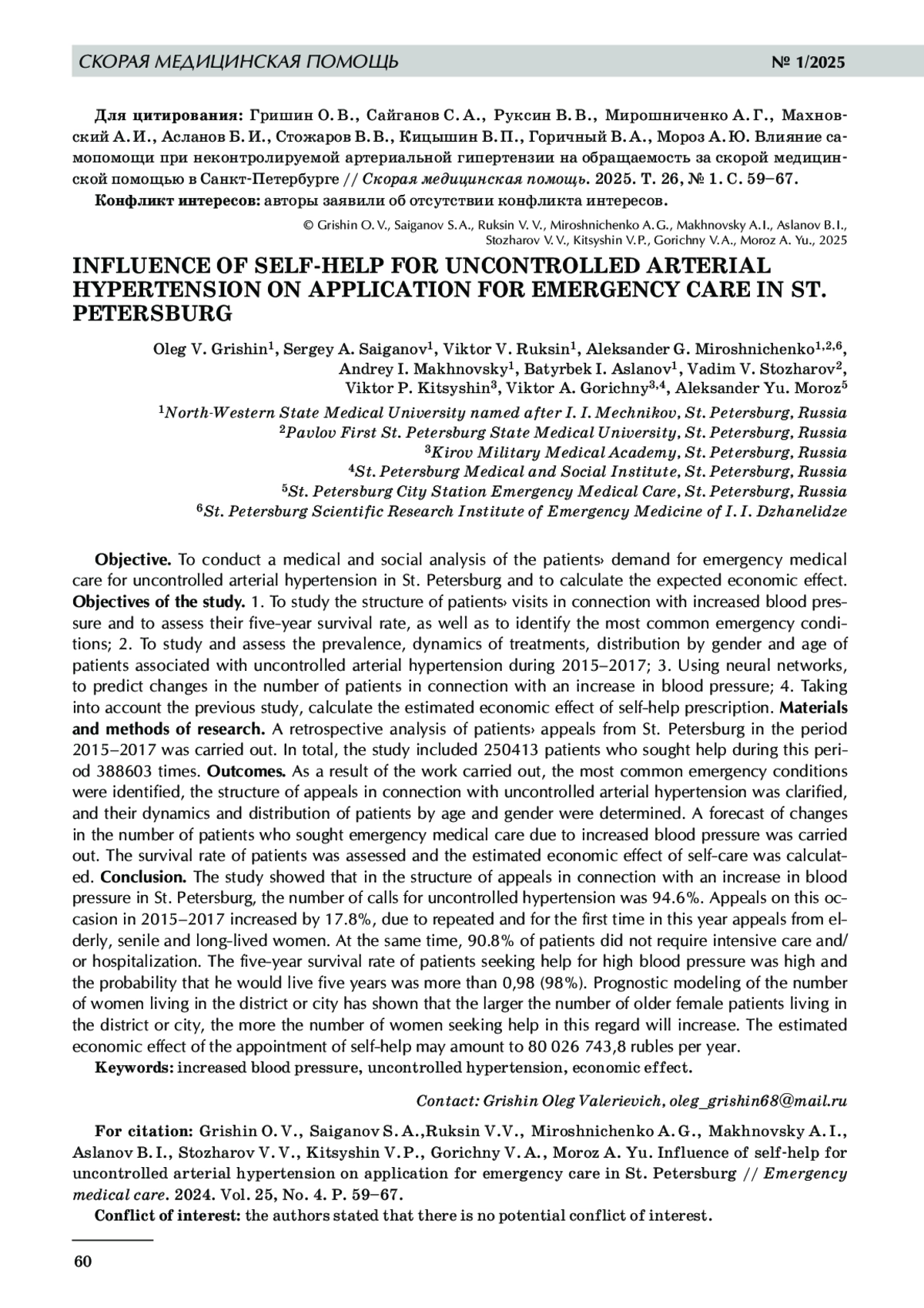 Цель исследования: провести медико-социальный анализ обращаемости пациентов за скорой медицинской помощью (СМП) по поводу неконтролируемой артериальной гипертензии в г. Санкт-Петербурге, рассчитать предполагаемый экономический эффект от назначения самопомощи. Задачи исследования: 1) изучить структуру обращений пациентов за СМП при повышении артериального давления и оценить их пятилетнюю выживаемость, а также выявить наиболее частые неотложные состояния; 2) изучить и оценить распространенность, динамику обращений, распределение по полу и возрасту пациентов, обратившихся в связи с неконтролируемой артериальной гипертензией в 2015– 2017 гг.; 3) с помощью нейронных сетей прогнозировать изменения обращаемости пациентов в связи с повышением артериального давления; 4) рассчитать предполагаемый экономический эффект от назначения самопомощи. Материалы и методы исследования. Проведен ретроспективный анализ обращений за СМП пациентов г. Санкт-Петербурга в 2015–2017 гг. Всего в исследование включены 250 413 пациентов, которые обратились за СМП в данный период 388 603 раза. Результаты исследования. Выявлены наиболее частые неотложные состояния, уточнена структура обращений в связи с неконтролируемой артериальной гипертензией, определены их динамика и распределение пациентов по возрасту и полу. Выполнено прогнозирование изменения обращаемости пациентов за СМП в связи с повышением артериального давления. Оценена пятилетняя выживаемость пациентов и рассчитан предполагаемый экономический эффект от назначения самопомощи. Заключение. Показано, что в структуре обращений за СМП в связи с повышением артериального давления в г. Санкт-Петербурге обращаемость по поводу неконтролируемой артериальной гипертензии составляла 94,6%. Количество обращений по данному поводу в 2015–2017 гг. увеличилось на 17,8%, прежде всего за счет многократных и впервые в данный период обращений женщин пожилого, старческого возраста и долгожителей. В проведении интенсивной терапии и/или госпитализации не нуждались 90,8% пациентов. Пятилетняя выживаемость пациентов, обращавшихся за СМП по поводу повышения артериального давления, составляла более 98%. Прогностическое моделирование обращаемости за СМП по поводу повышения артериального давления показало ее зависимость от количества пациентов женского пола старших возрастных групп (пожилого, старческого возраста и долгожителей). Предполагаемый экономический эффект от назначения самопомощи составил 80 026 743,8 руб. в год.