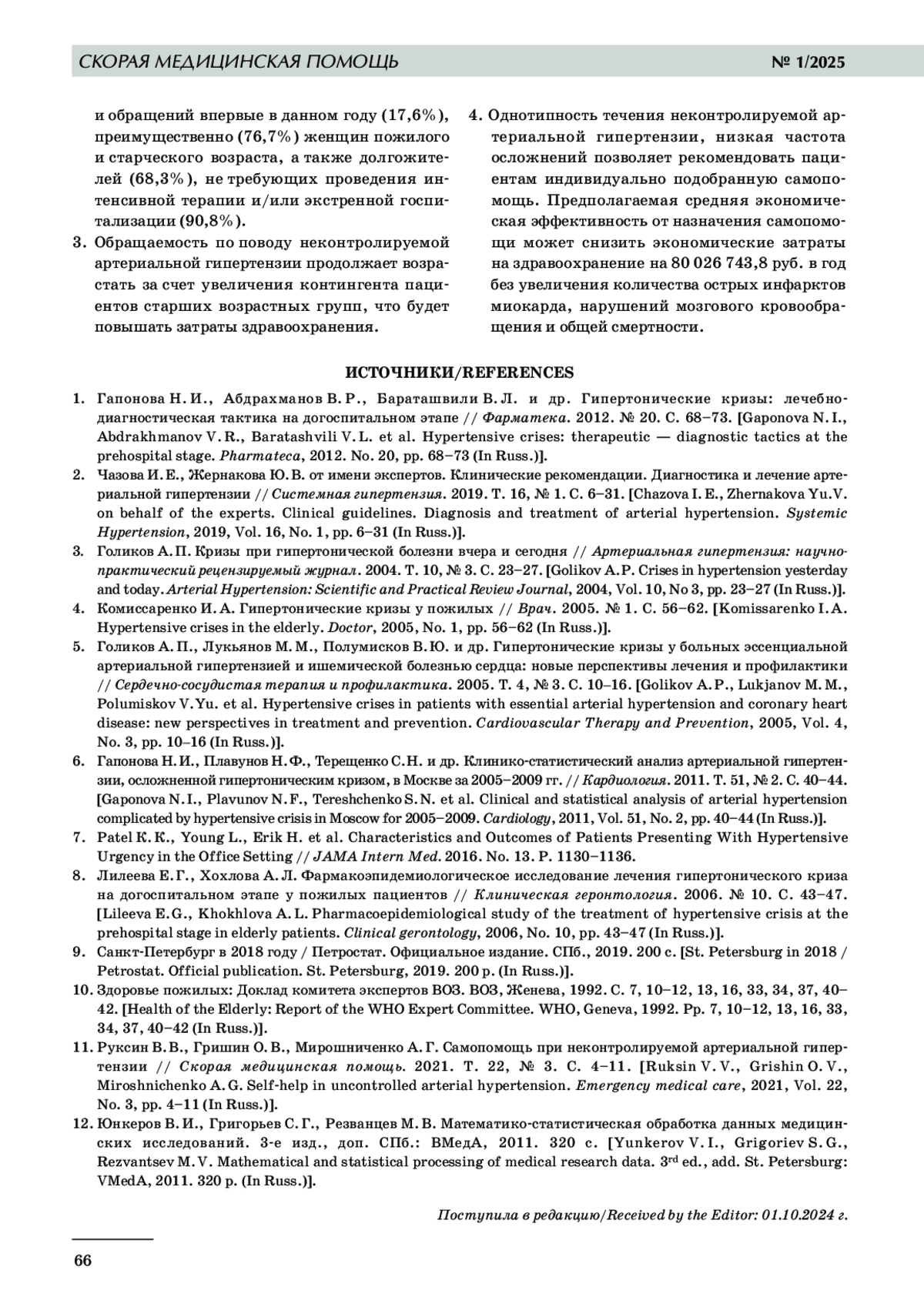 Lileeva E. G., Khokhlova A. L. Pharmacoepidemiological study of the treatment of hypertensive crisis at the prehospital stage in elderly patients. Clinical gerontology, 2006, No. 10, рр. 43-47 (In Russ.).