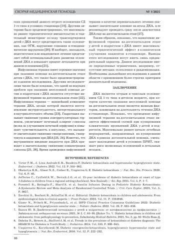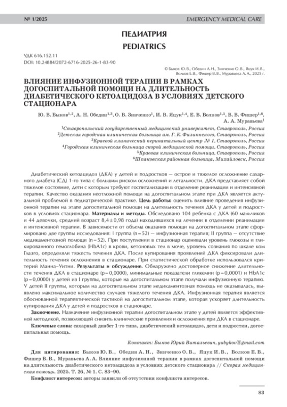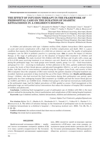 Статья: ВЛИЯНИЕ ИНФУЗИОННОЙ ТЕРАПИИ В РАМКАХ ДОГОСПИТАЛЬНОЙ ПОМОЩИ НА ДЛИТЕЛЬНОСТЬ ДИАБЕТИЧЕСКОГО КЕТОАЦИДОЗА В УСЛОВИЯХ ДЕТСКОГО СТАЦИОНАРА (2025)