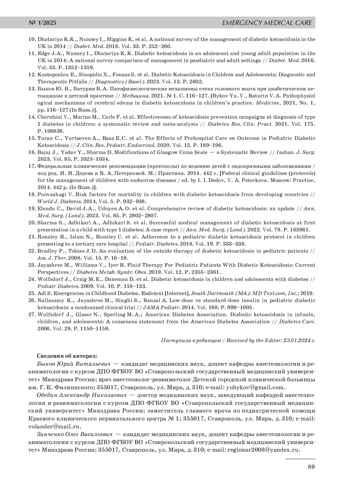 БЫКОВ Ю. В., ОБЕДИН А. Н., ЗИНЧЕНКО О. В., ЯЦУК И. В., ВОЛКОВ Е. В., ФИШЕР В. В., МУРАВЬЁВА А. А. ВЛИЯНИЕ ИНФУЗИОННОЙ ТЕРАПИИ В РАМКАХ ДОГОСПИТАЛЬНОЙ ПОМОЩИ НА ДЛИТЕЛЬНОСТЬ ДИАБЕТИЧЕСКОГО КЕТОАЦИДОЗА В УСЛОВИЯХ ДЕТСКОГО СТАЦИОНАРА // СКОРАЯ МЕДИЦИНСКАЯ ПОМОЩЬ. 2025. № 1, ТОМ 26