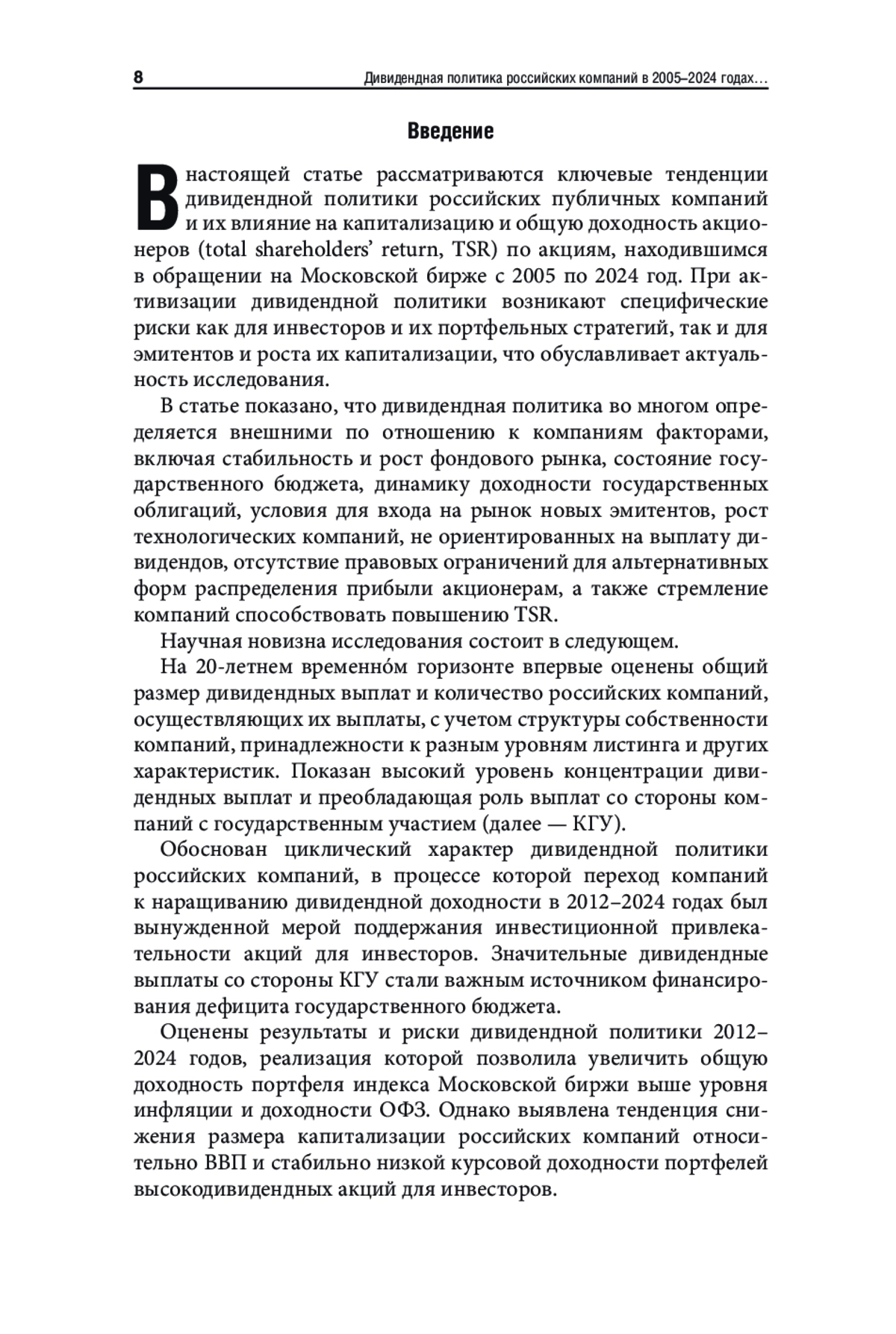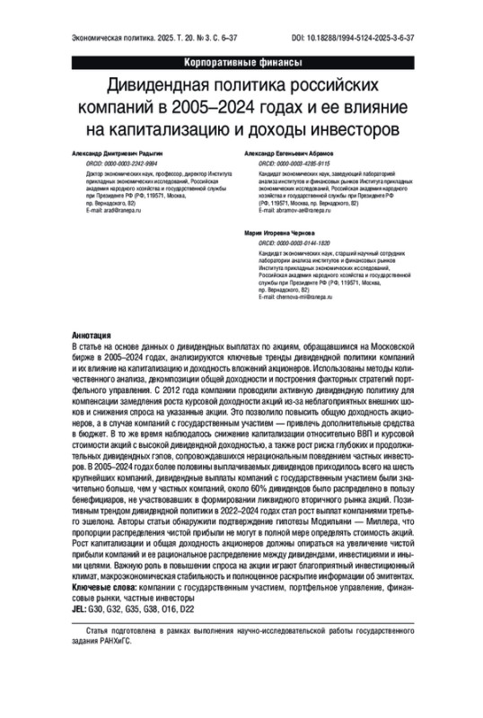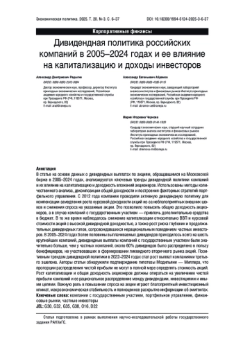 В статье на основе данных о дивидендных выплатах по акциям, обращавшимся на Московской бирже в 2005–2024 годах, анализируются ключевые тренды дивидендной политики компаний и их влияние на капитализацию и доходность вложений акционеров. Использованы методы количественного анализа, декомпозиции общей доходности и построения факторных стратегий портфельного управления. С 2012 года компании проводили активную дивидендную политику для компенсации замедления роста курсовой доходности акций из-за неблагоприятных внешних шоков и снижения спроса на указанные акции. Это позволило повысить общую доходность акционеров, а в случае компаний с государственным участием — привлечь дополнительные средства в бюджет. В то же время наблюдалось снижение капитализации относительно ВВП и курсовой стоимости акций с высокой дивидендной доходностью, а также рост риска глубоких и продолжительных дивидендных гэпов, сопровождавшихся нерациональным поведением частных инвесторов. В 2005–2024 годах более половины выплачиваемых дивидендов приходилось всего на шесть крупнейших компаний, дивидендные выплаты компаний с государственным участием были значительно больше, чем у частных компаний, около 60% дивидендов было распределено в пользу бенефициаров, не участвовавших в формировании ликвидного вторичного рынка акций. Позитивным трендом дивидендной политики в 2022–2024 годах стал рост выплат компаниями третьего эшелона. Авторы статьи обнаружили подтверждение гипотезы Модильяни — Миллера, что пропорции распределения чистой прибыли не могут в полной мере определять стоимость акций. Рост капитализации и общая доходность акционеров должны опираться на увеличение чистой прибыли компаний и ее рациональное распределение между дивидендами, инвестициями и иными целями. Важную роль в повышении спроса на акции играют благоприятный инвестиционный климат, макроэкономическая стабильность и полноценное раскрытие информации об эмитентах.