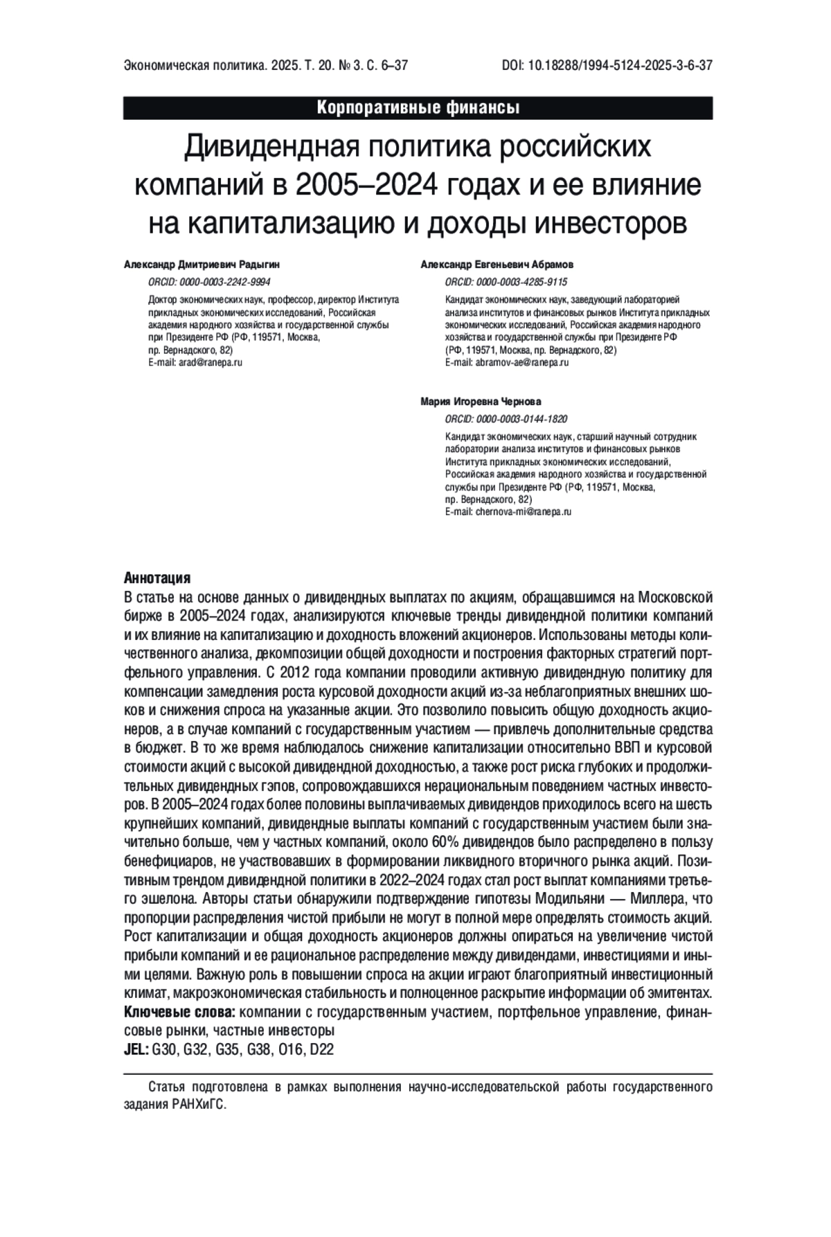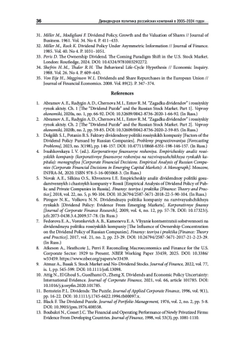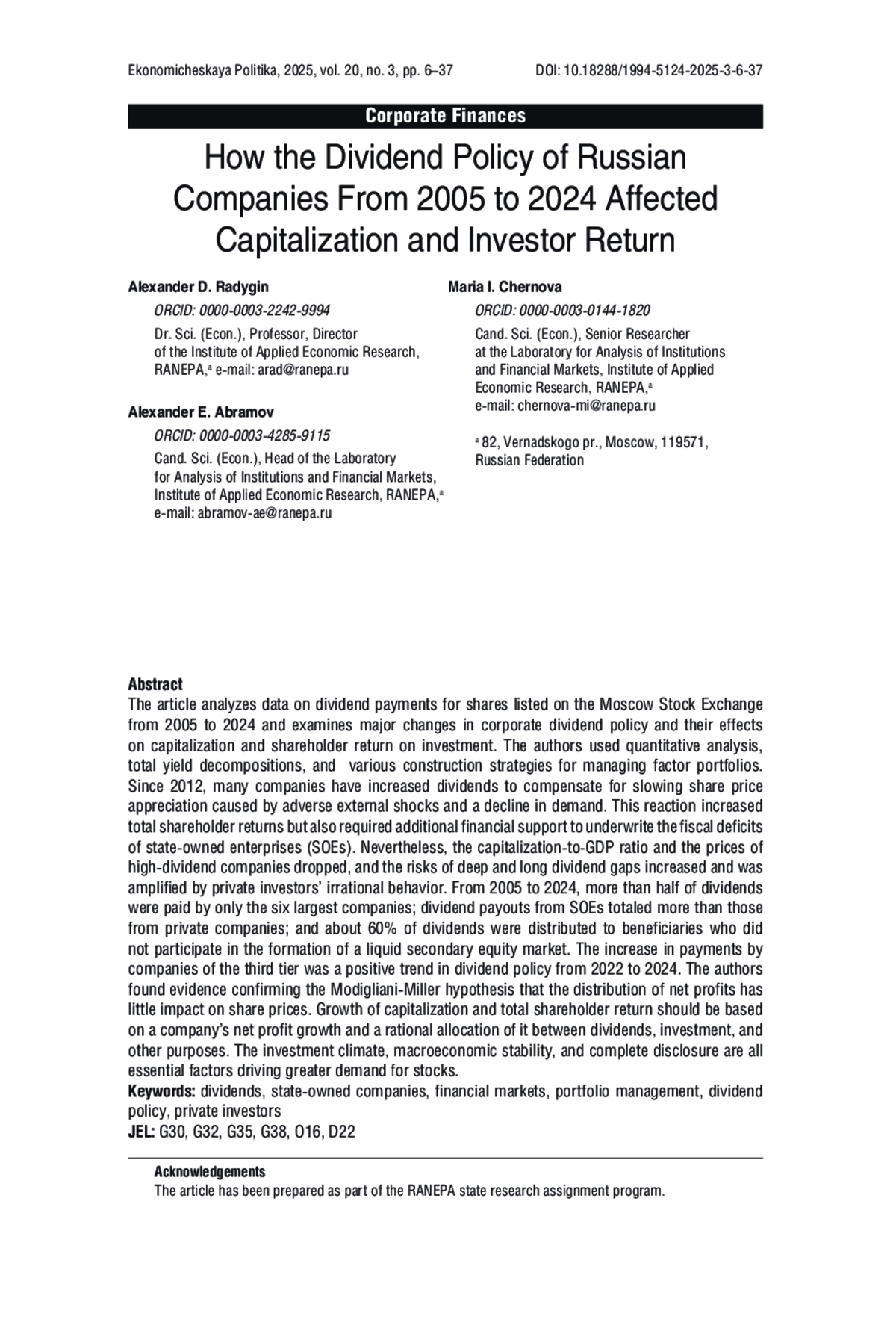 2. Абрамов А. Е., Радыгин А. Д., Чернова М. И., Энтов Р. М. «Загадка дивидендов» и российский рынок акций. Ч. 2 // Вопросы экономики. 2020b. № 2. С. 59-85. https://doi.org/10.32609/0042-8736-2020-2-59-85.