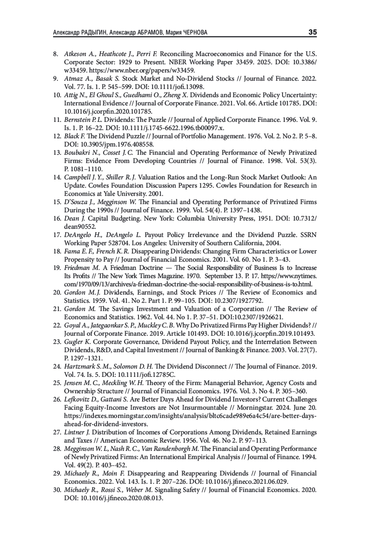 22. Goyal A., Jategaonkar S. P., Muckley C. B. Why Do Privatized Firms Pay Higher Dividends? // Journal of Corporate Finance. 2019. Article 101493. https://doi.org/10.1016/j.jcorpfin.2019.101493.