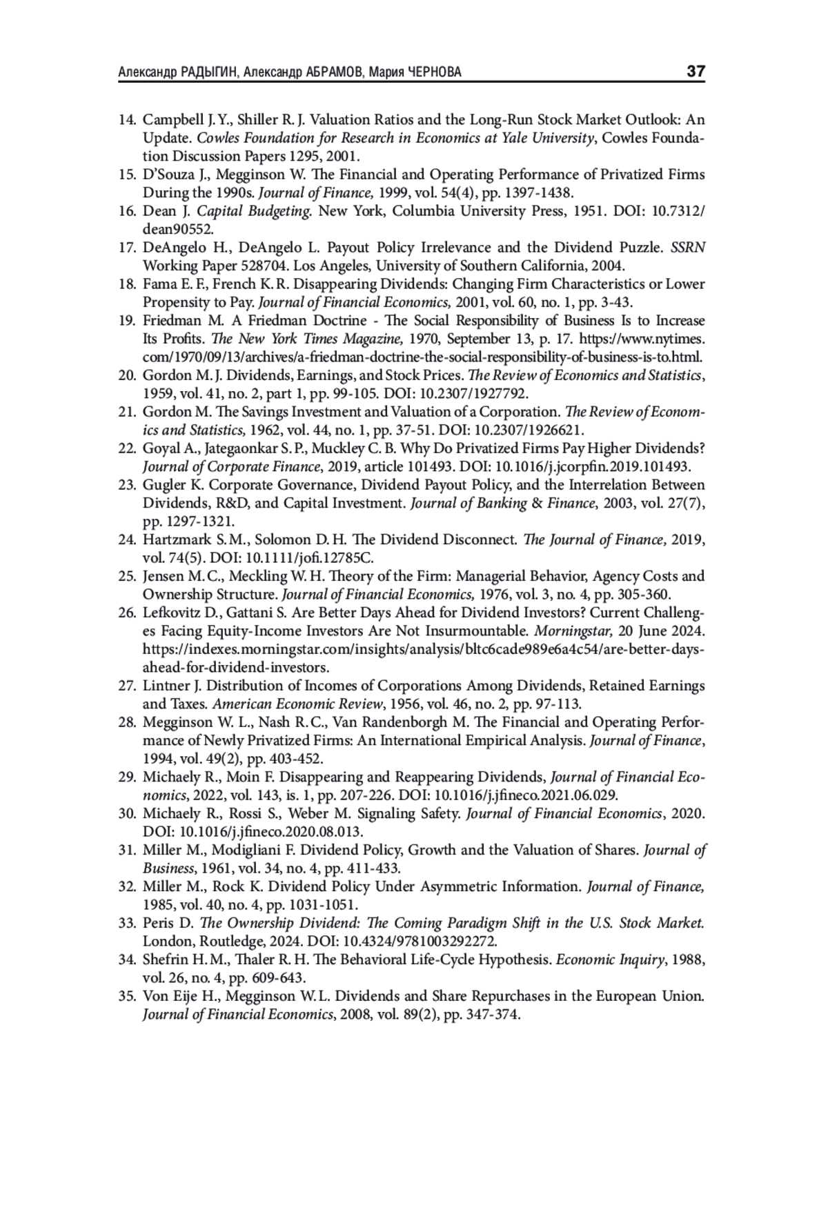 35. Von Eije H., Megginson W. L. Dividends and Share Repurchases in the European Union // Journal of Financial Economics. 2008. Vol. 89(2). P. 347-374.